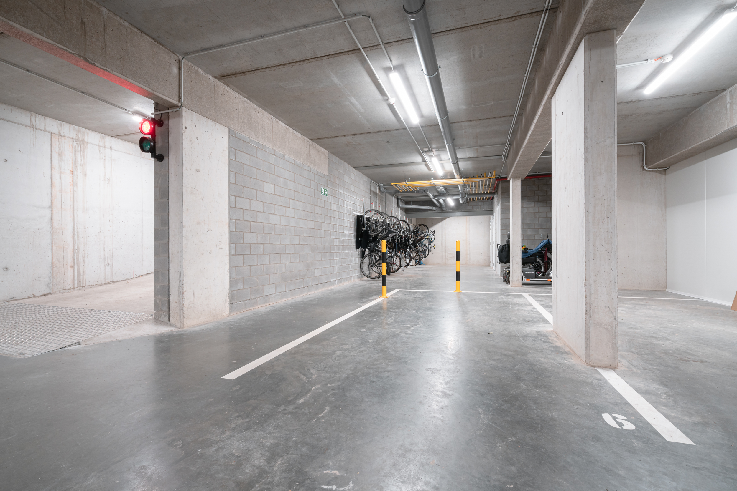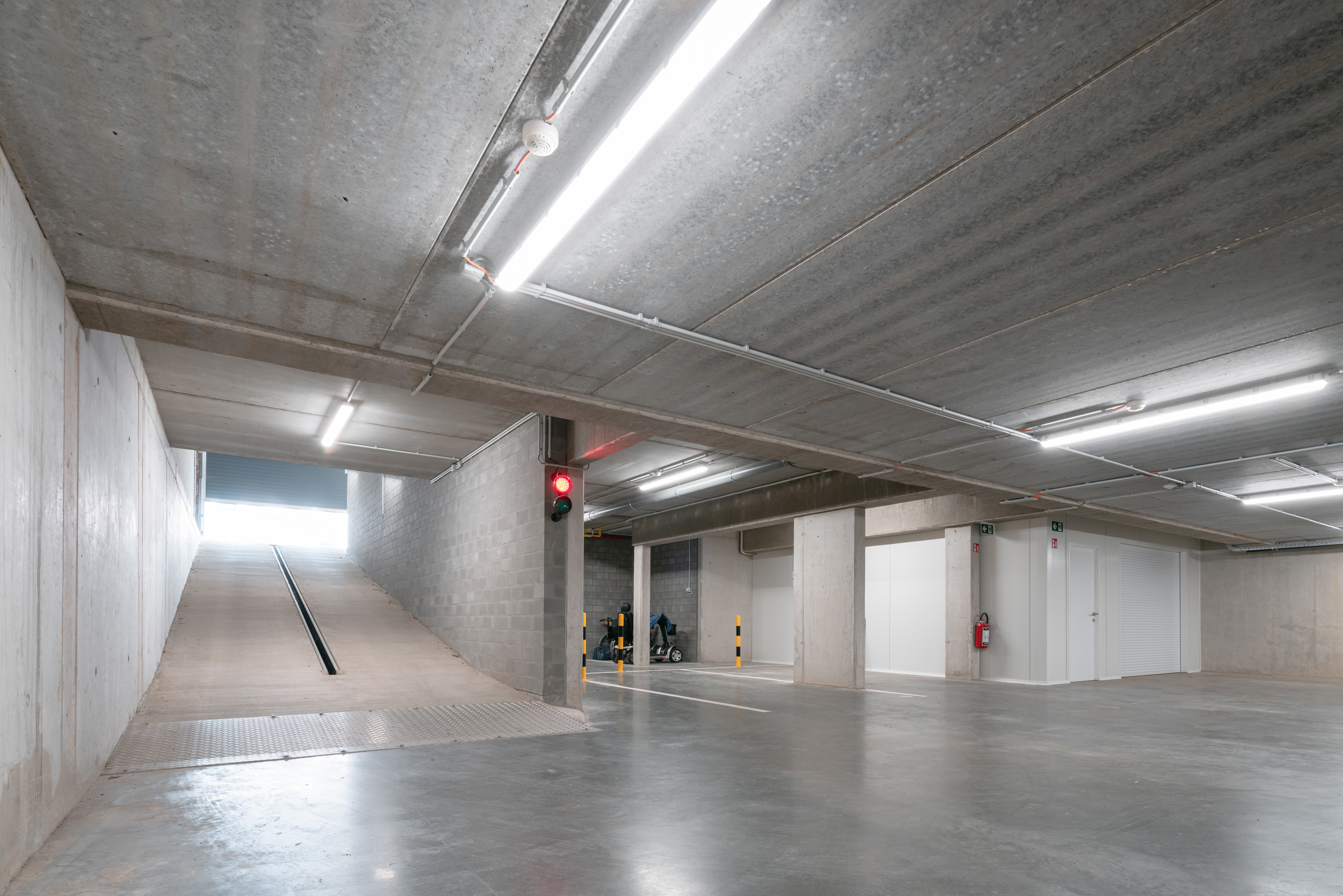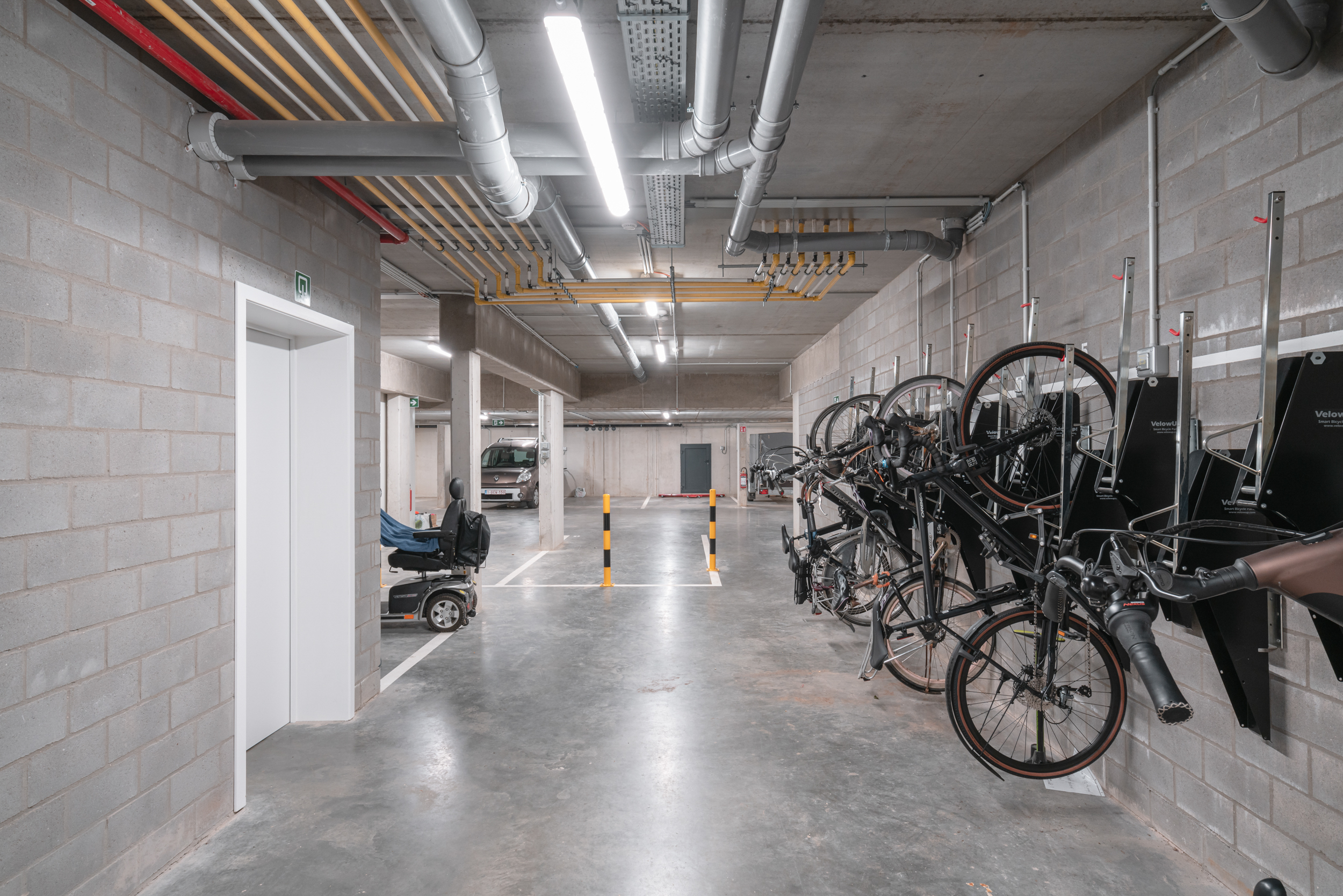 De ondergrondse parking biedt ruimte aan voldoende wagens en is voorzien van een zeer ruime fietsenstalling met een aangepast systeem om fietsen op te hangen. Ook werd een handige fietsgeul voorzien om ook zwaardere elektrische fietsen zonder ongelukken in de kelder te krijgen.