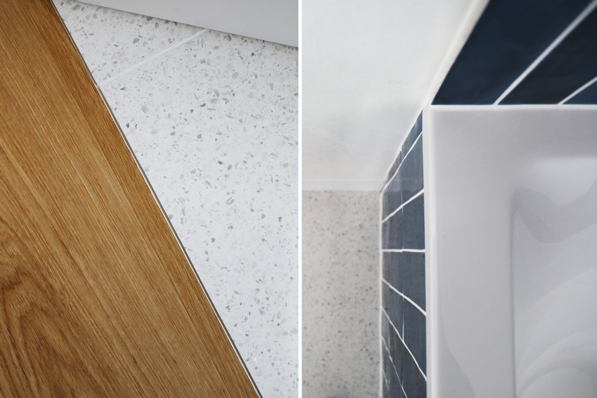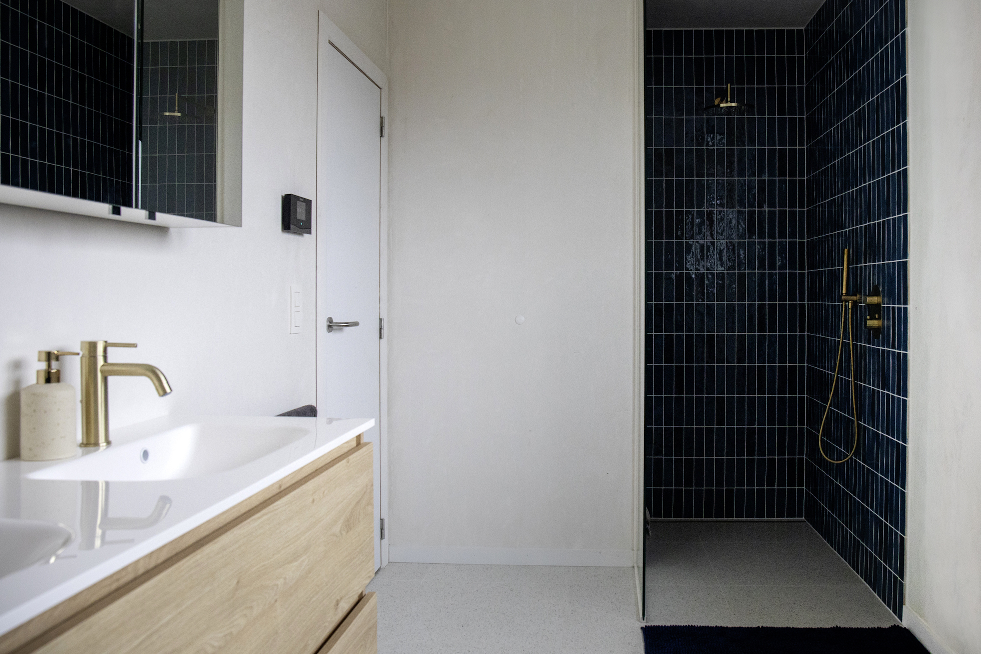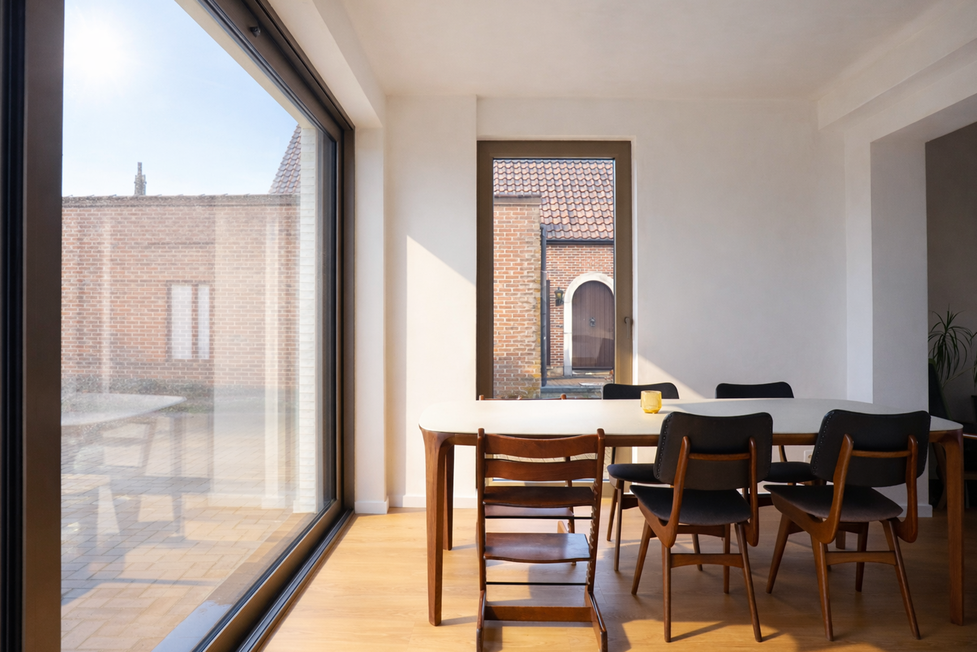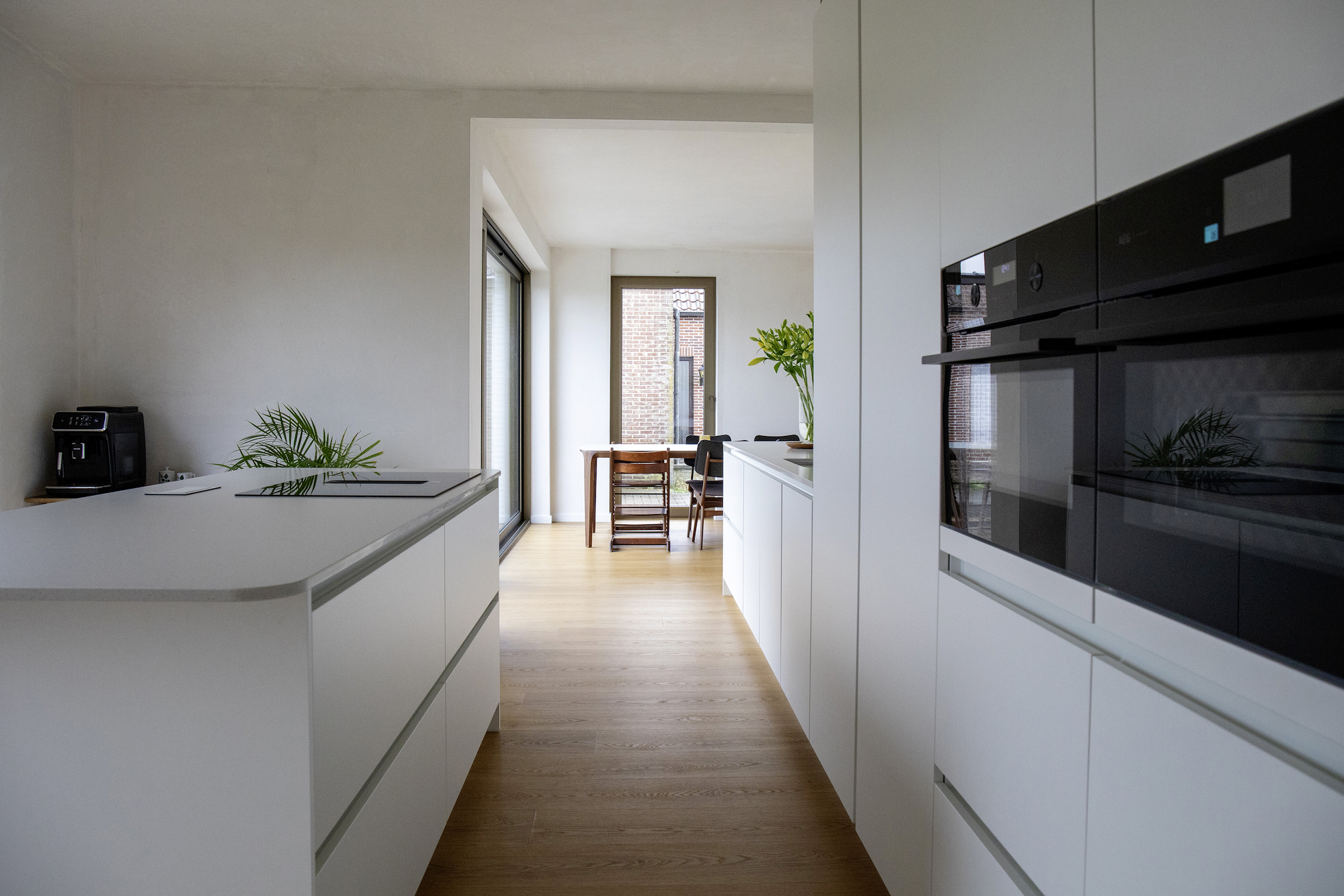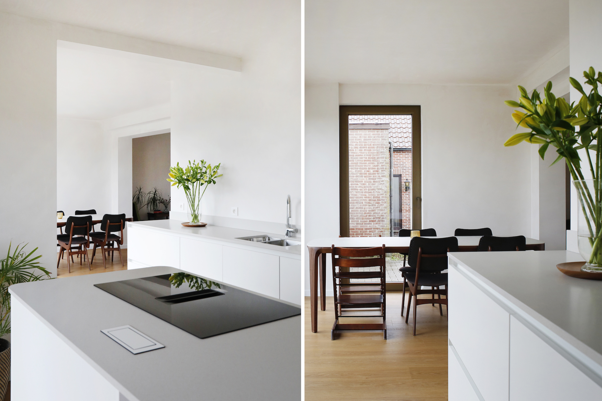 Ook het gelijkvloers werd volledig herorganiseerd. De keuken werd verplaatst van de zijgevel naar de tuinzijde van de woning. Hierdoor ontstaat een open plan waarbij de leefruimtes zich maximaal naar de tuin richten. De voormalige garage kreeg een nieuwe functie als wasberging en praktische achteringang.