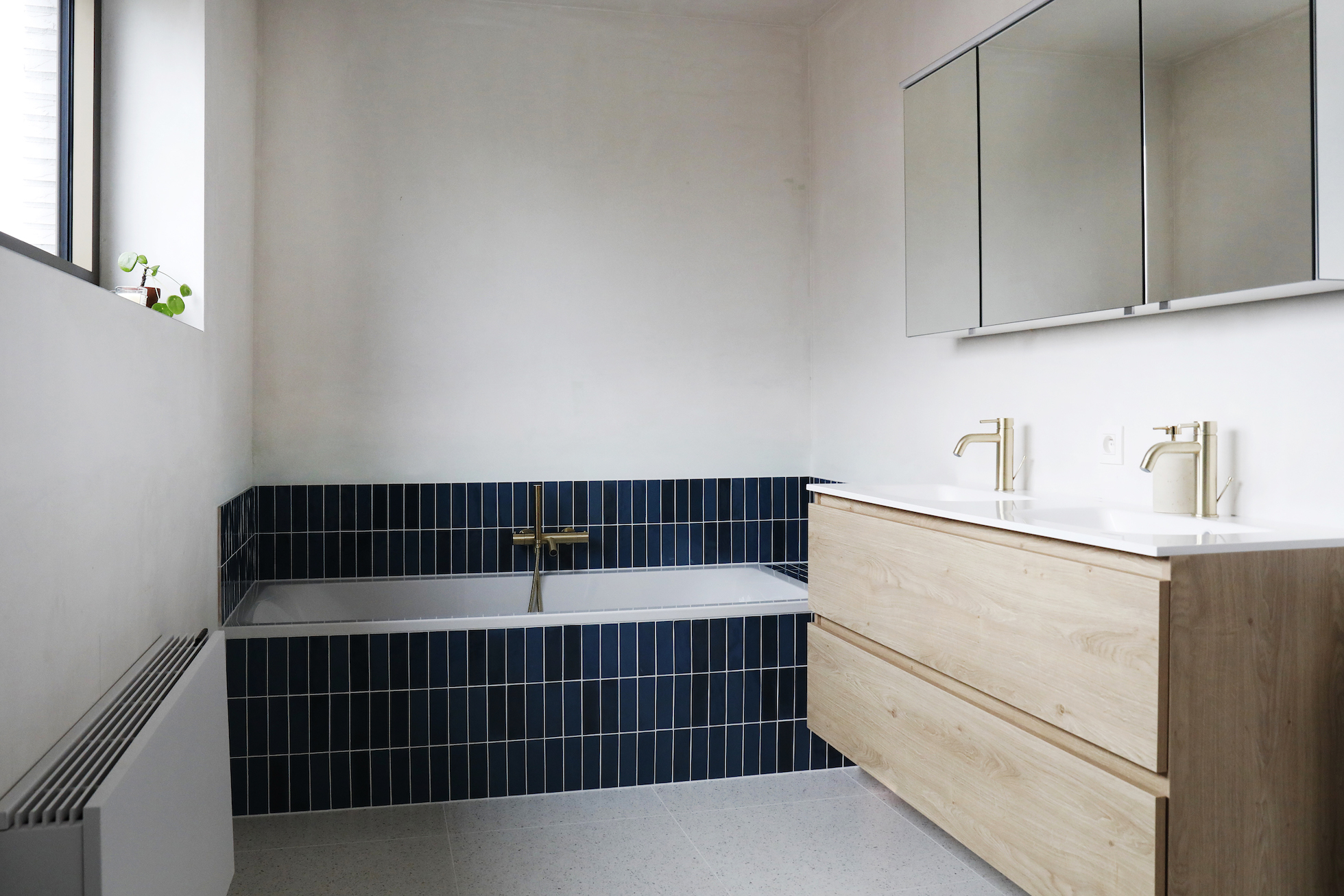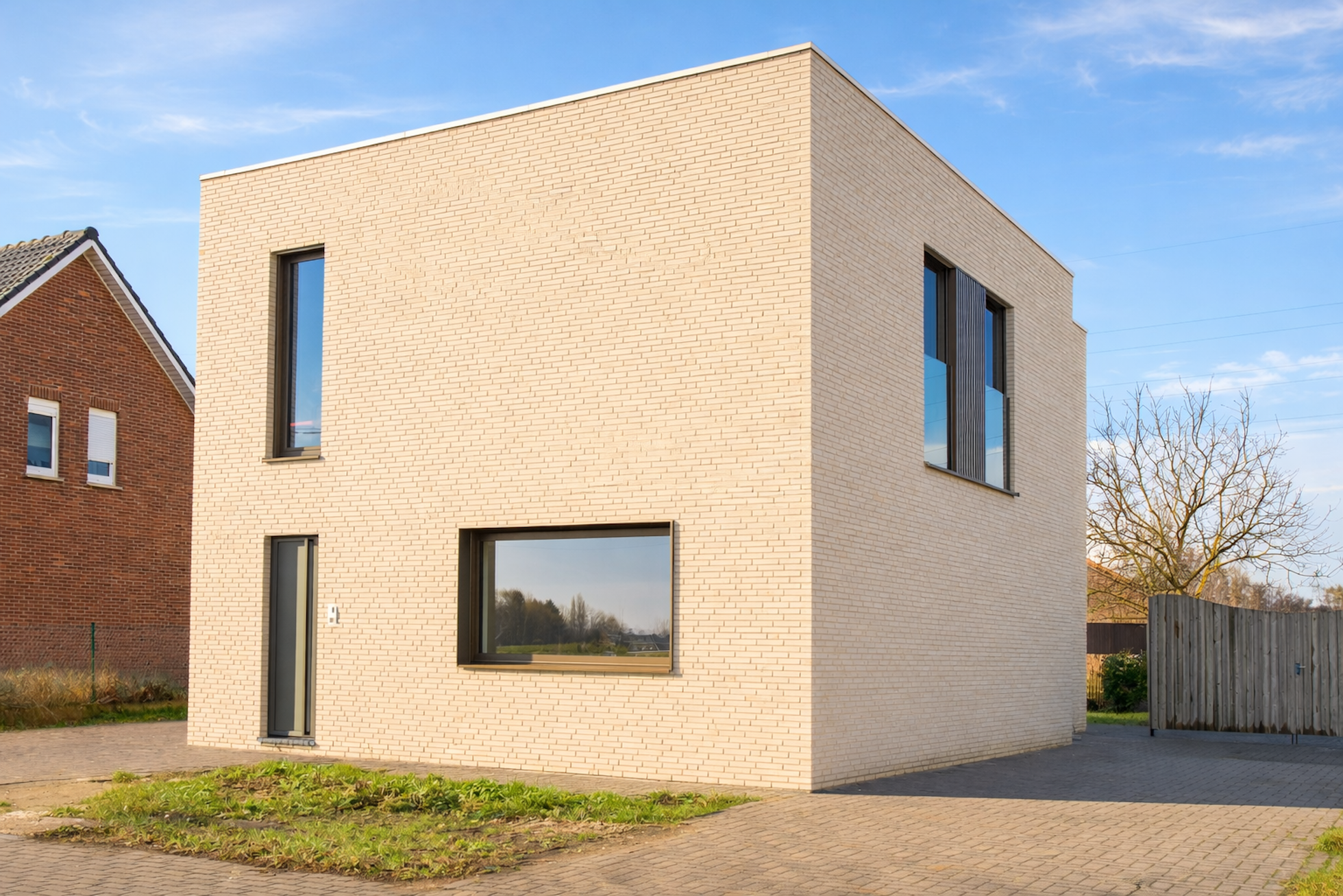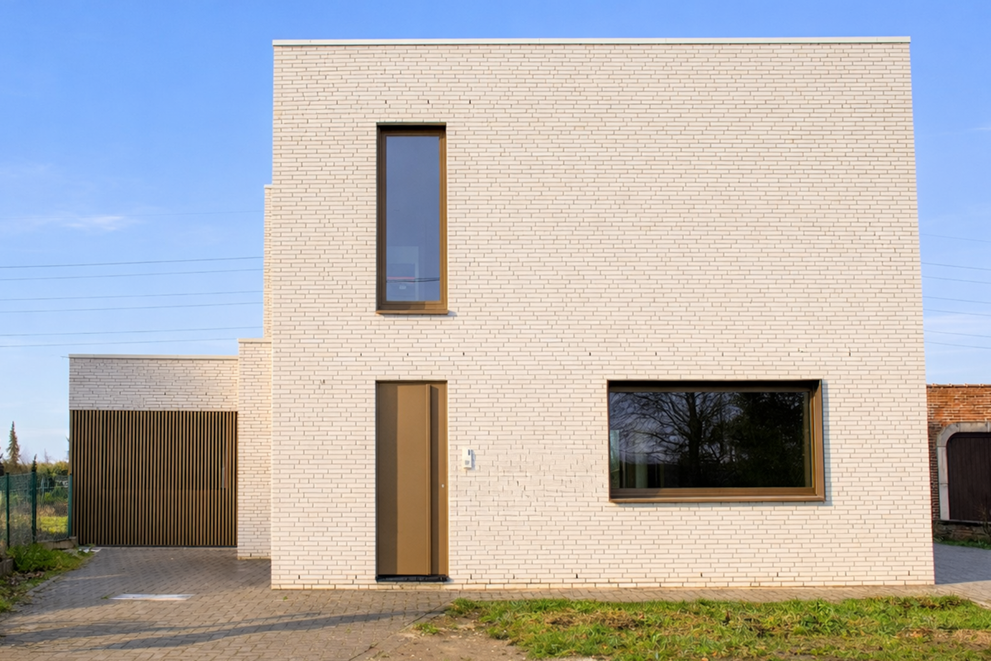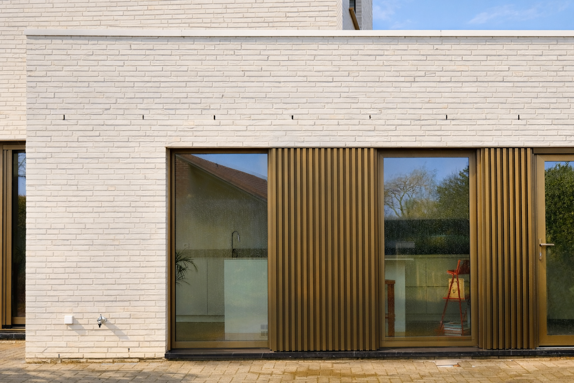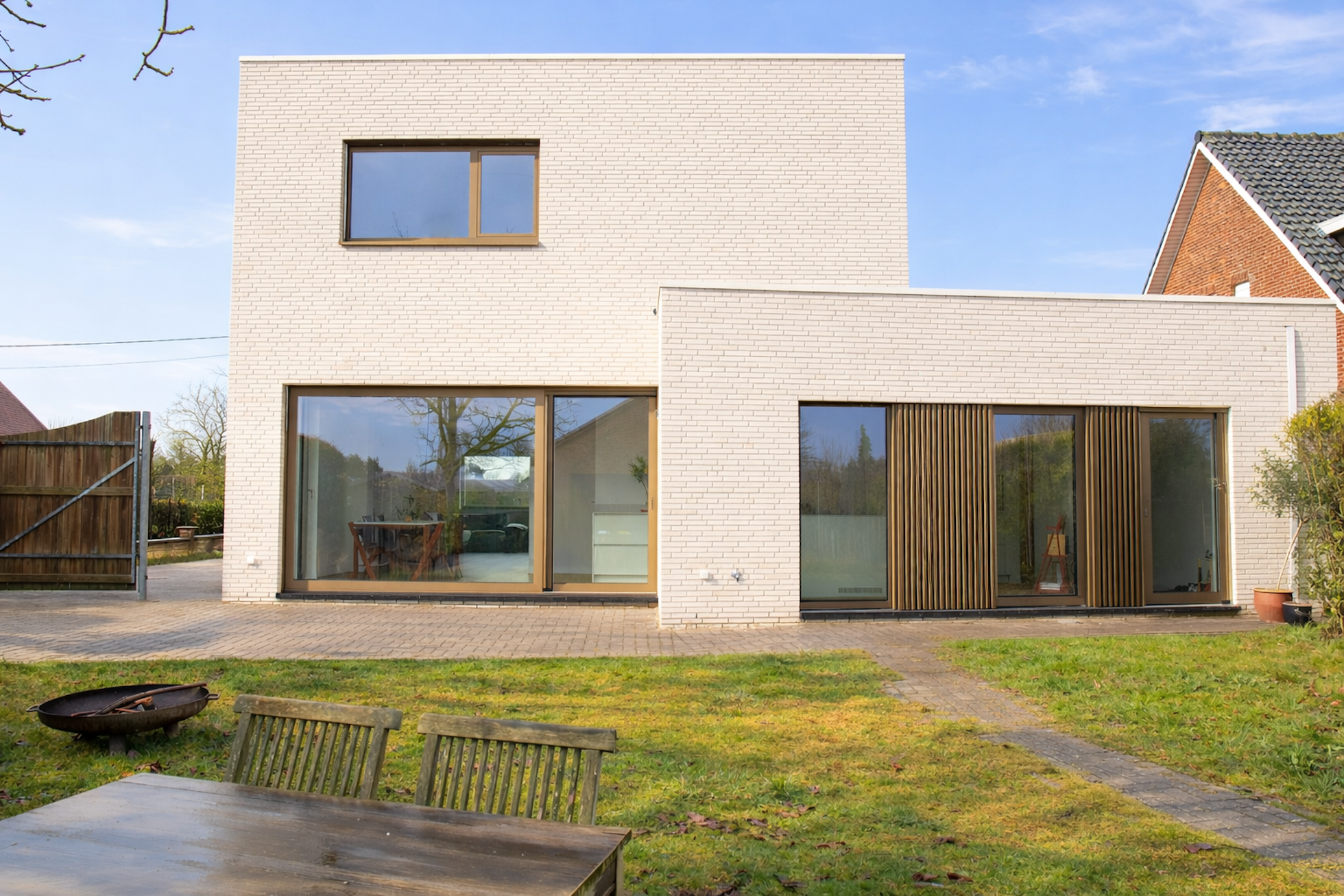 De nieuwe gevels in lichte baksteen worden gecombineerd met buitenschrijnwerk in bronskleurig aluminium. De heldere volumetrie en de verfijnde materialisatie geven de woning een hedendaagse en rustige architectuur.