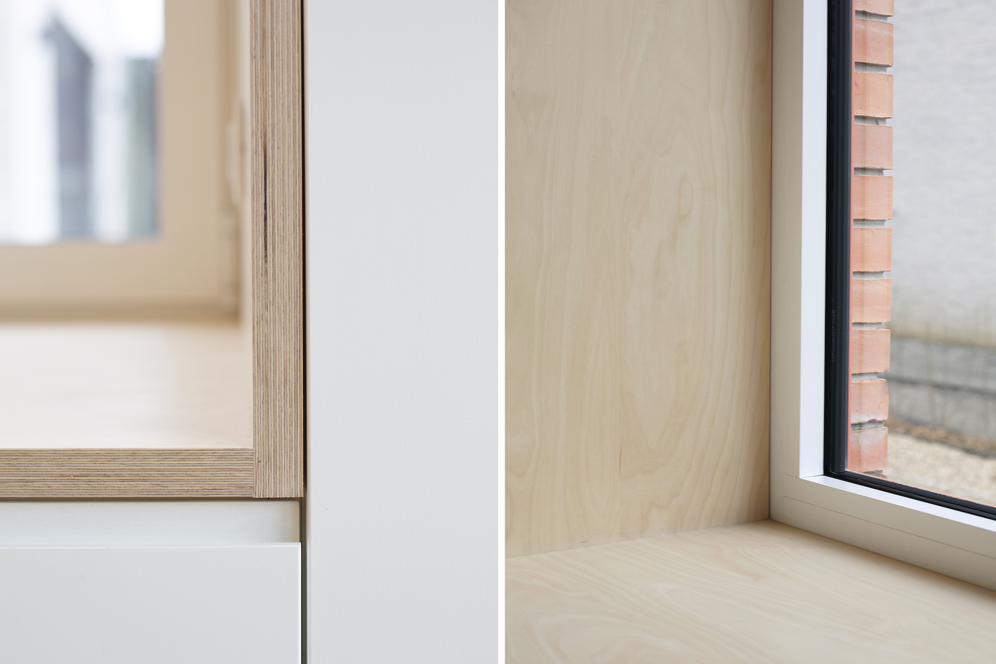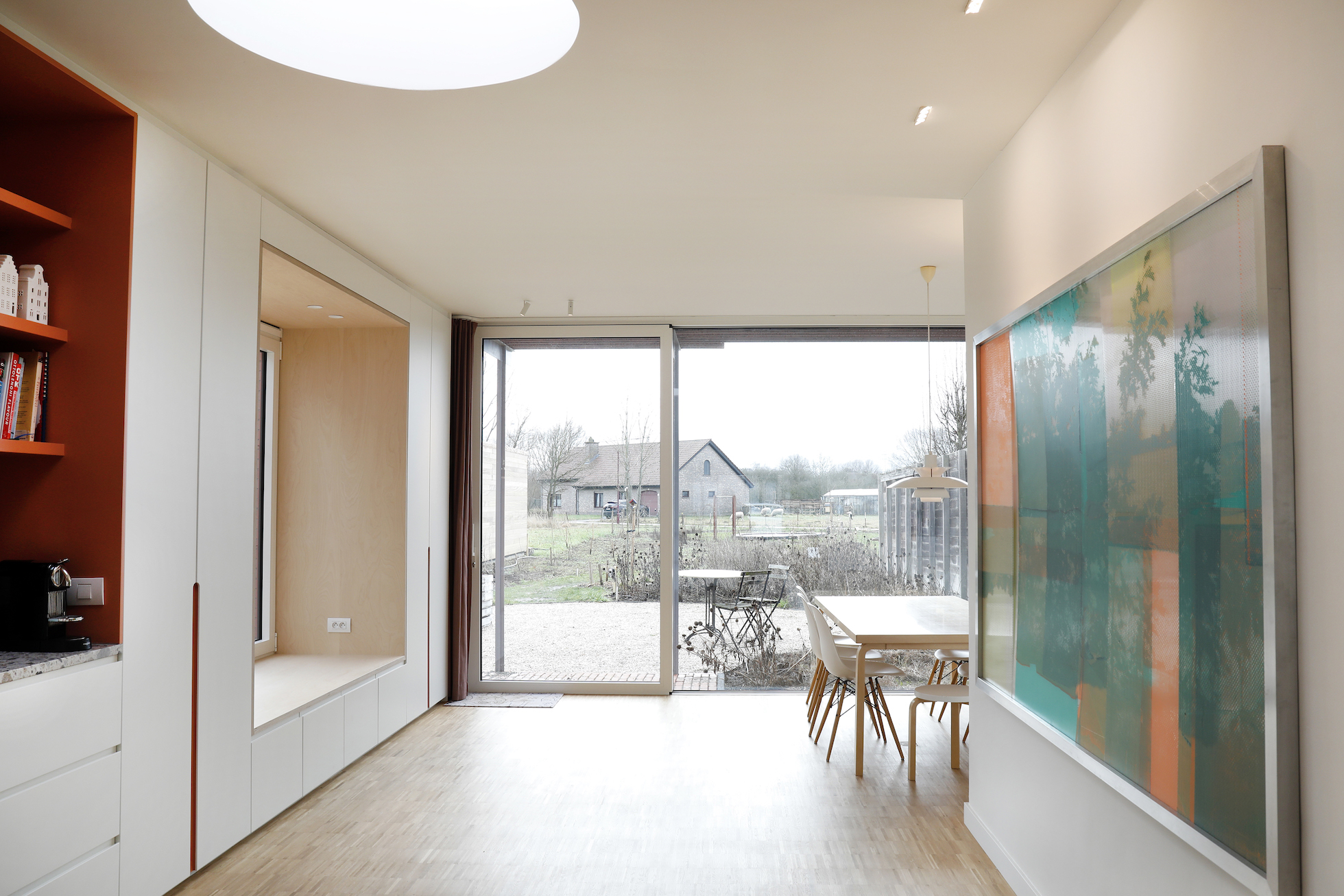 De keuken neemt een centrale positie in. Vanuit de keuken is er ruim zicht op de tuin. Grote glaspartijen zorgen voor maximale lichtinval en versterken de relatie met buiten. Vaste zonwering werd geïntegreerd in het ontwerp om oververhitting te beperken zonder het open karakter te verliezen. Een zitraam aan de tuinzijde zorgt voor een extra plek om te lezen, te zitten of gewoon naar buiten te kijken.
