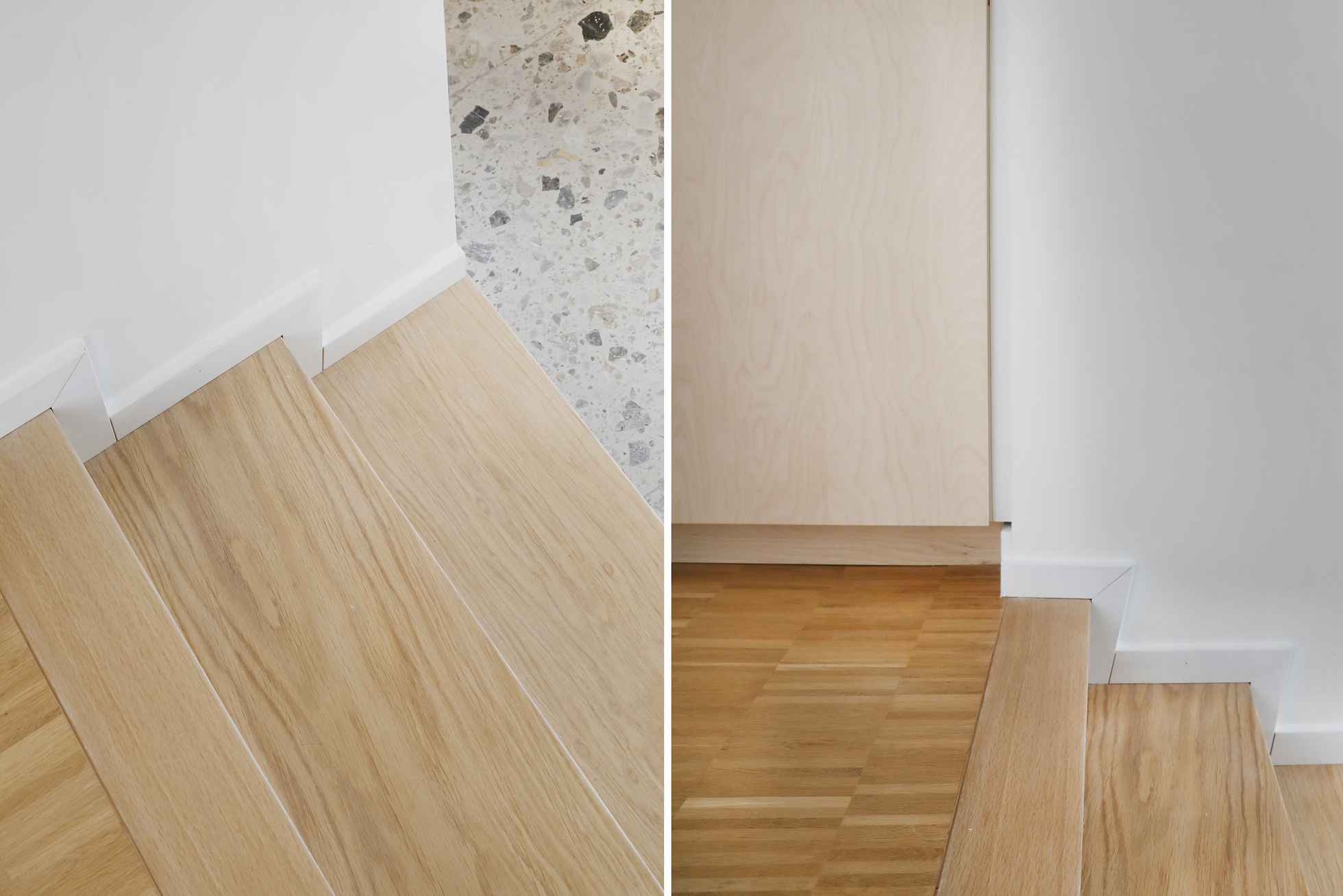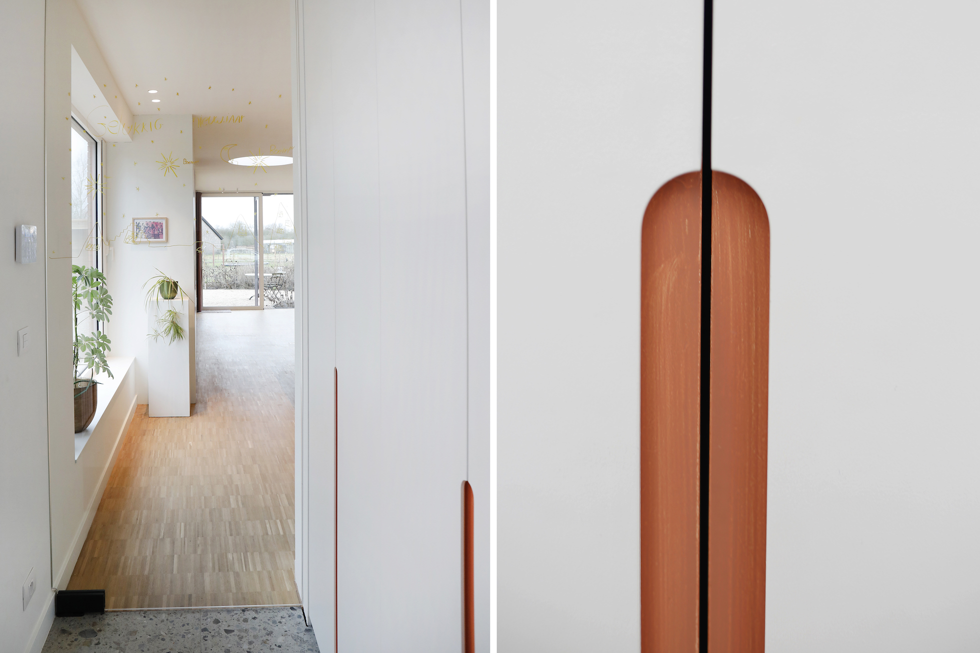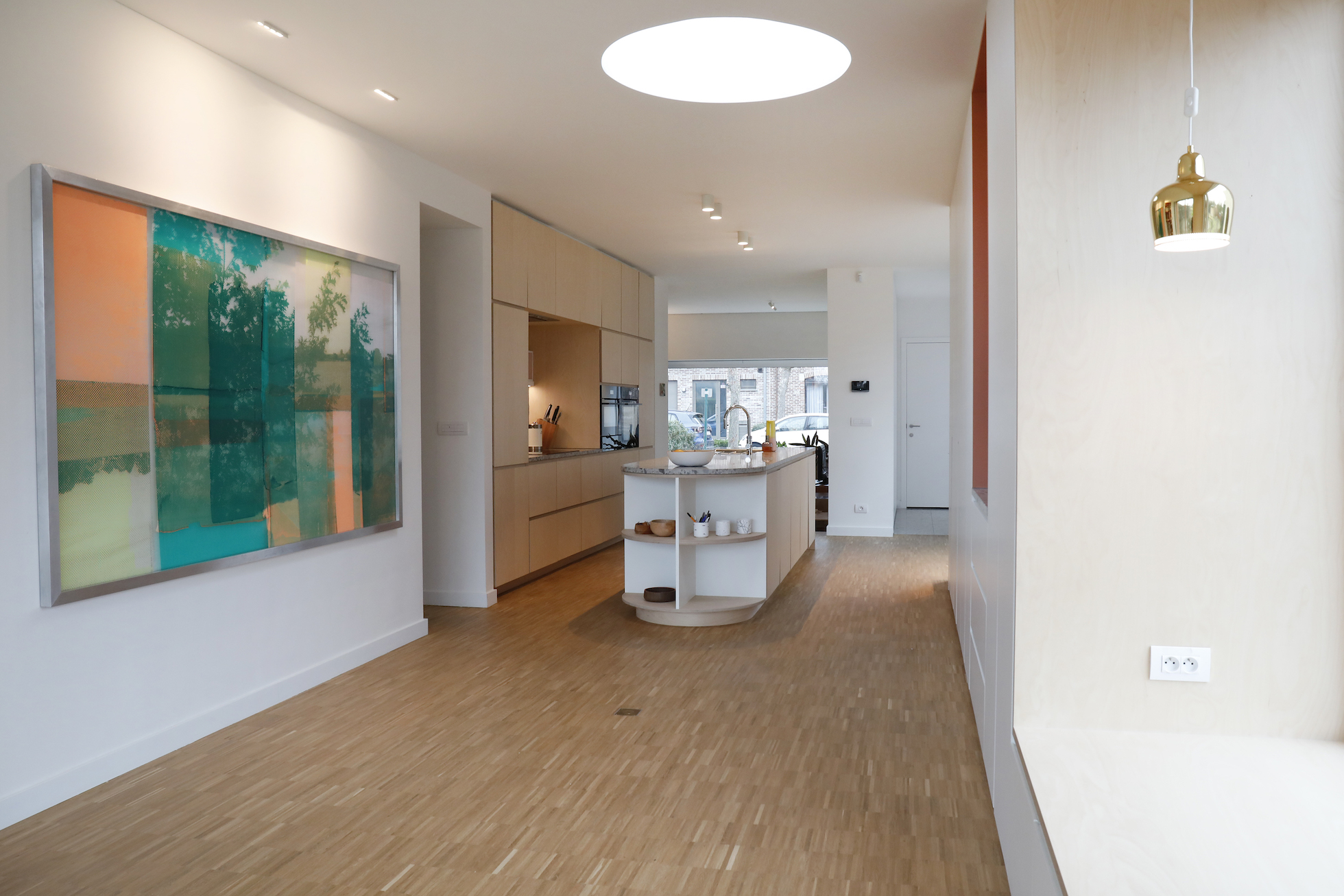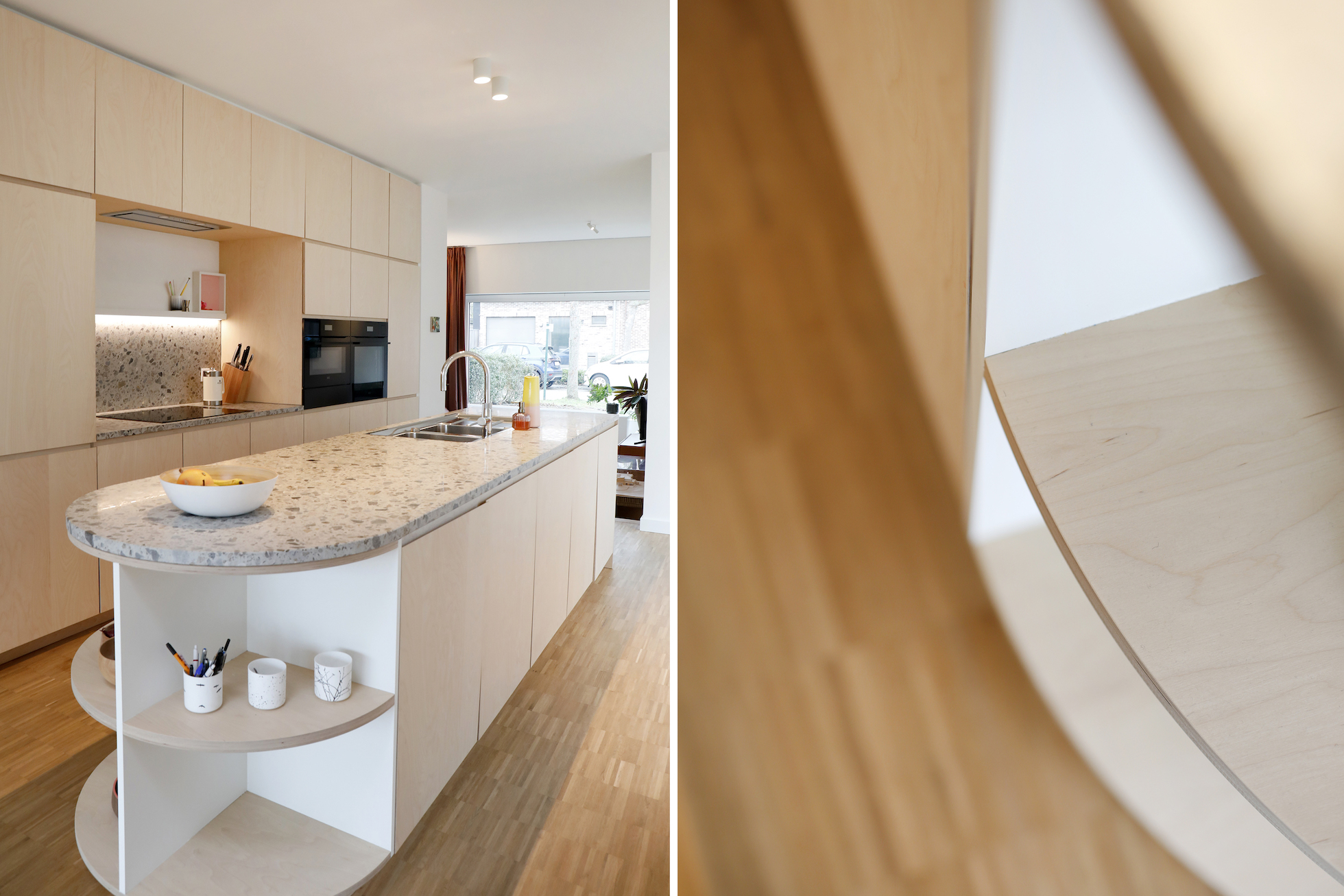 De materiaalkeuze versterkt het rustige karakter van de woning. Parket werd doorgetrokken, ook in de keuken, wat zorgt voor continuïteit in de leefruimte. In combinatie met terrazzo — toegepast als vloeraccent en keukenblad — ontstaat een evenwicht tussen warmte en robuustheid.