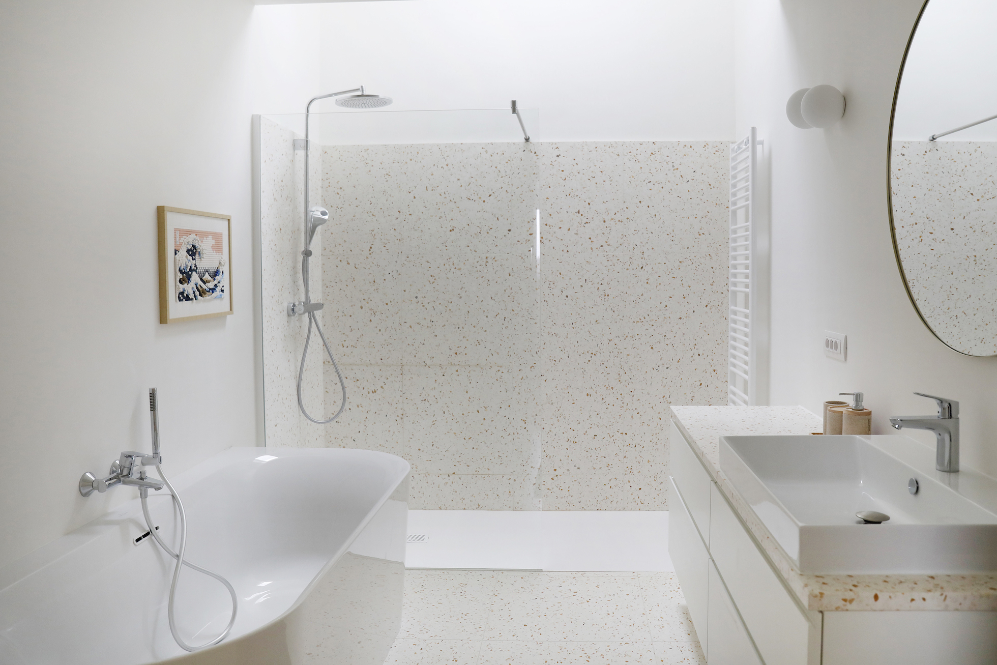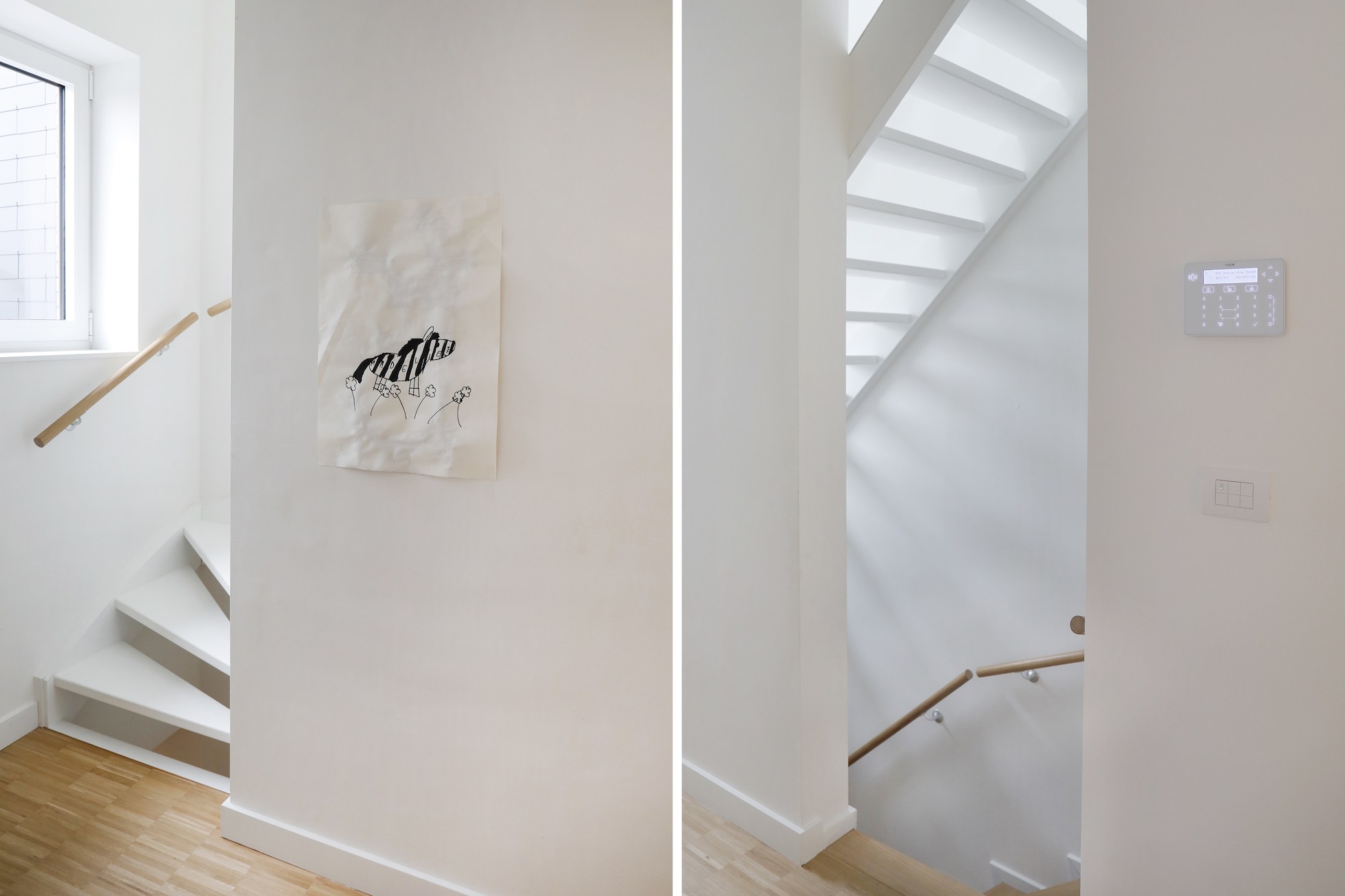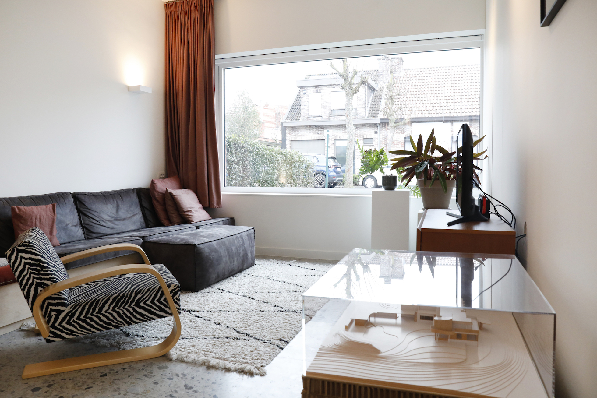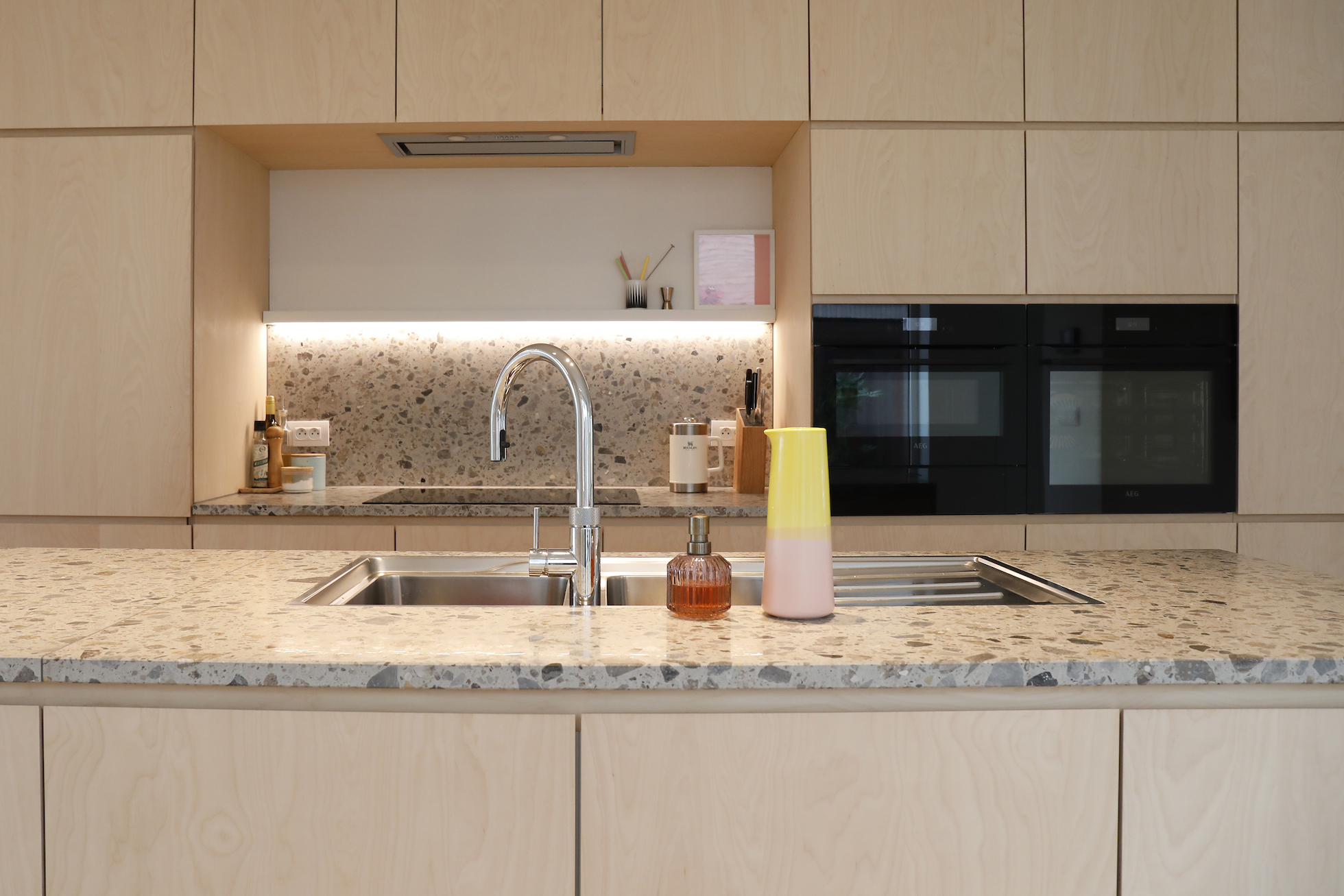 De materiaalkeuze versterkt het rustige karakter van de woning. Parket werd doorgetrokken, ook in de keuken, wat zorgt voor continuïteit in de leefruimte. In combinatie met terrazzo — toegepast als vloeraccent en keukenblad — ontstaat een evenwicht tussen warmte en robuustheid.