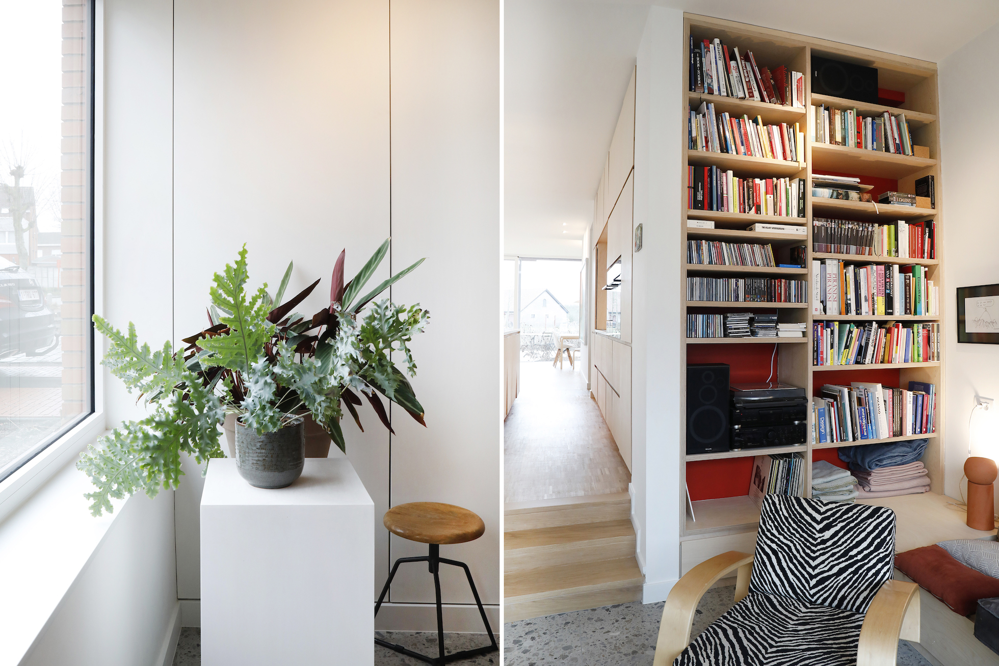 De berging werd bewust compact gehouden. Een deel van de praktische functies wordt opgevangen door ingemaakte kasten in de leefruimte. Hierdoor blijft de woning efficiënt georganiseerd zonder extra vierkante meters in te nemen.