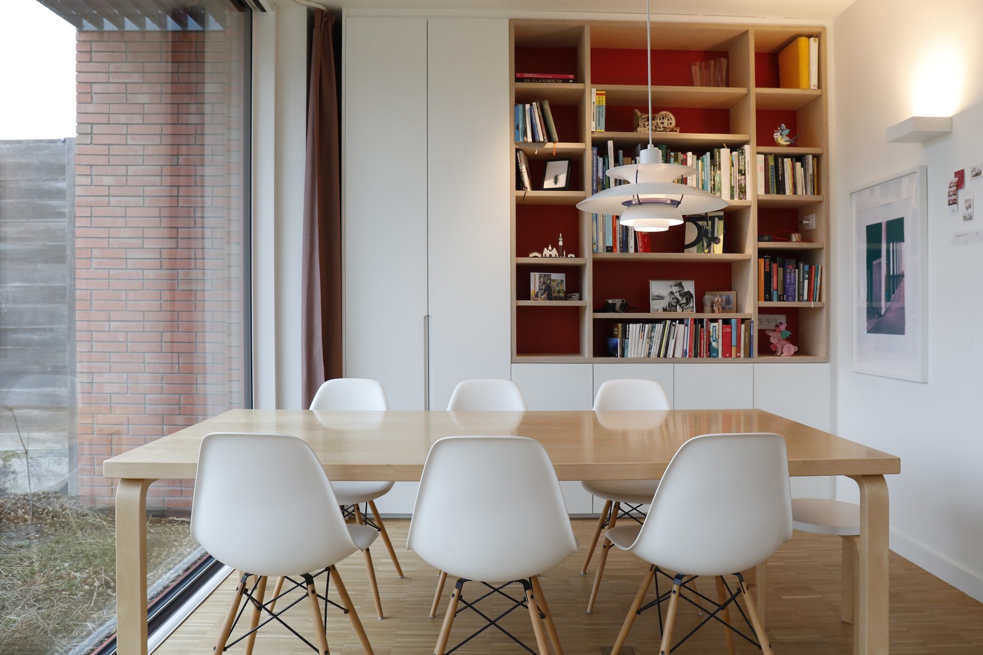 De zitput vormt een rustige plek binnen het open plan. De zetel werd ingewerkt, net als de boekenkast, waardoor het geheel compact en samenhangend aanvoelt. De eetkamer ligt iets teruggetrokken achter een hoek, in de nabijheid van de boekenkast. Zo ontstaat een meer intieme plek binnen de grotere ruimte.
