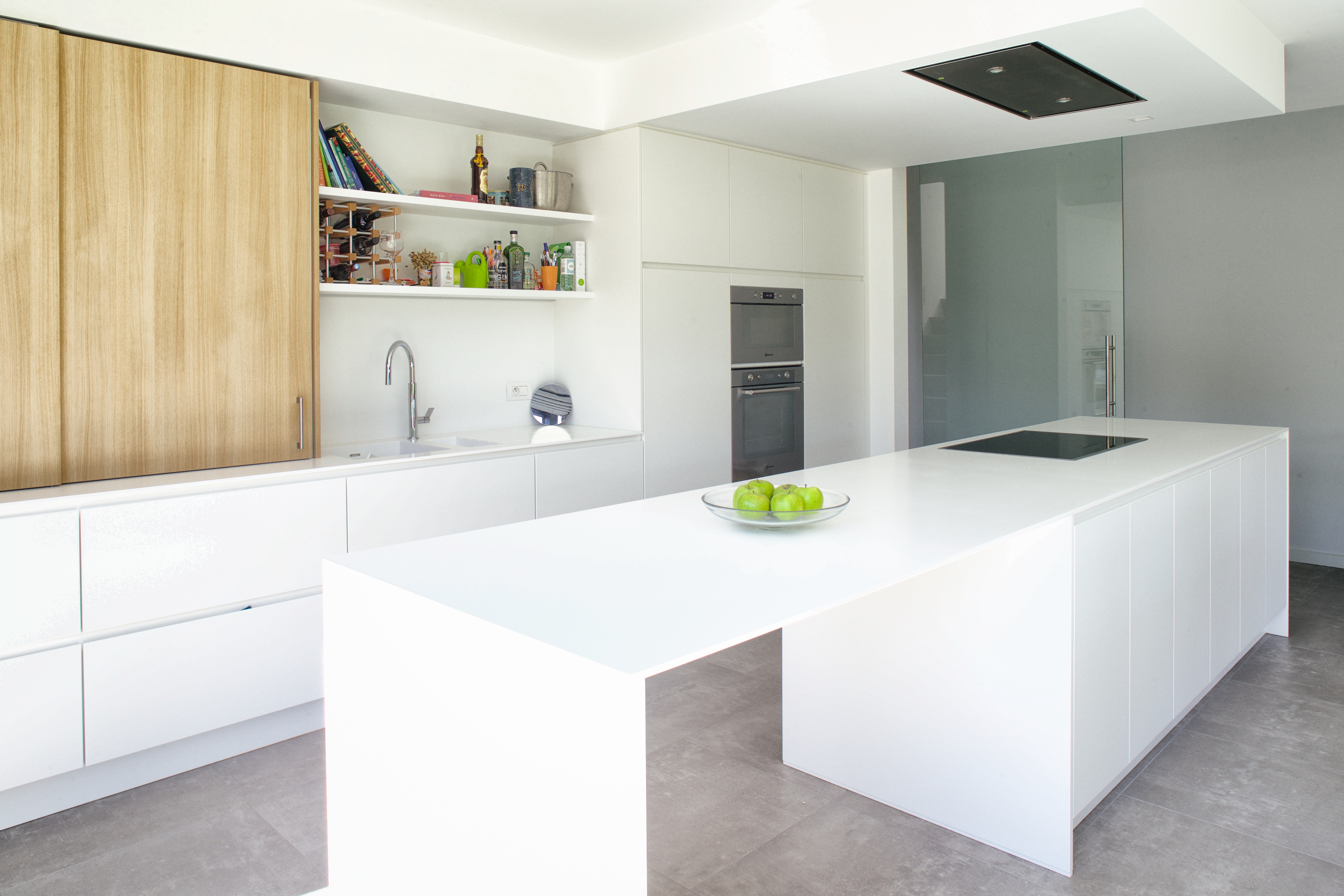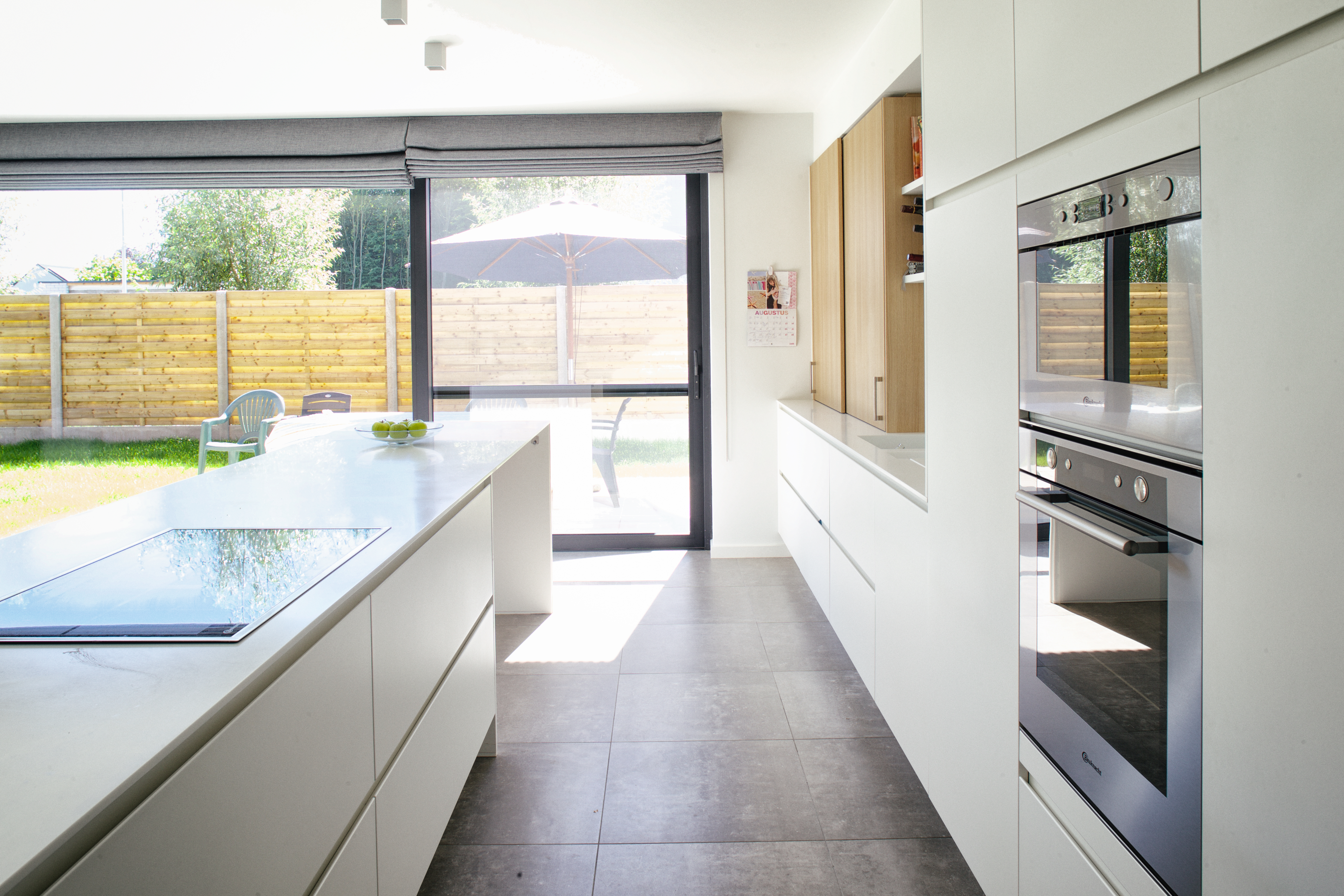 De leefruimte en leefkeuken vormen één geheel en geven beide uit op de tuin.