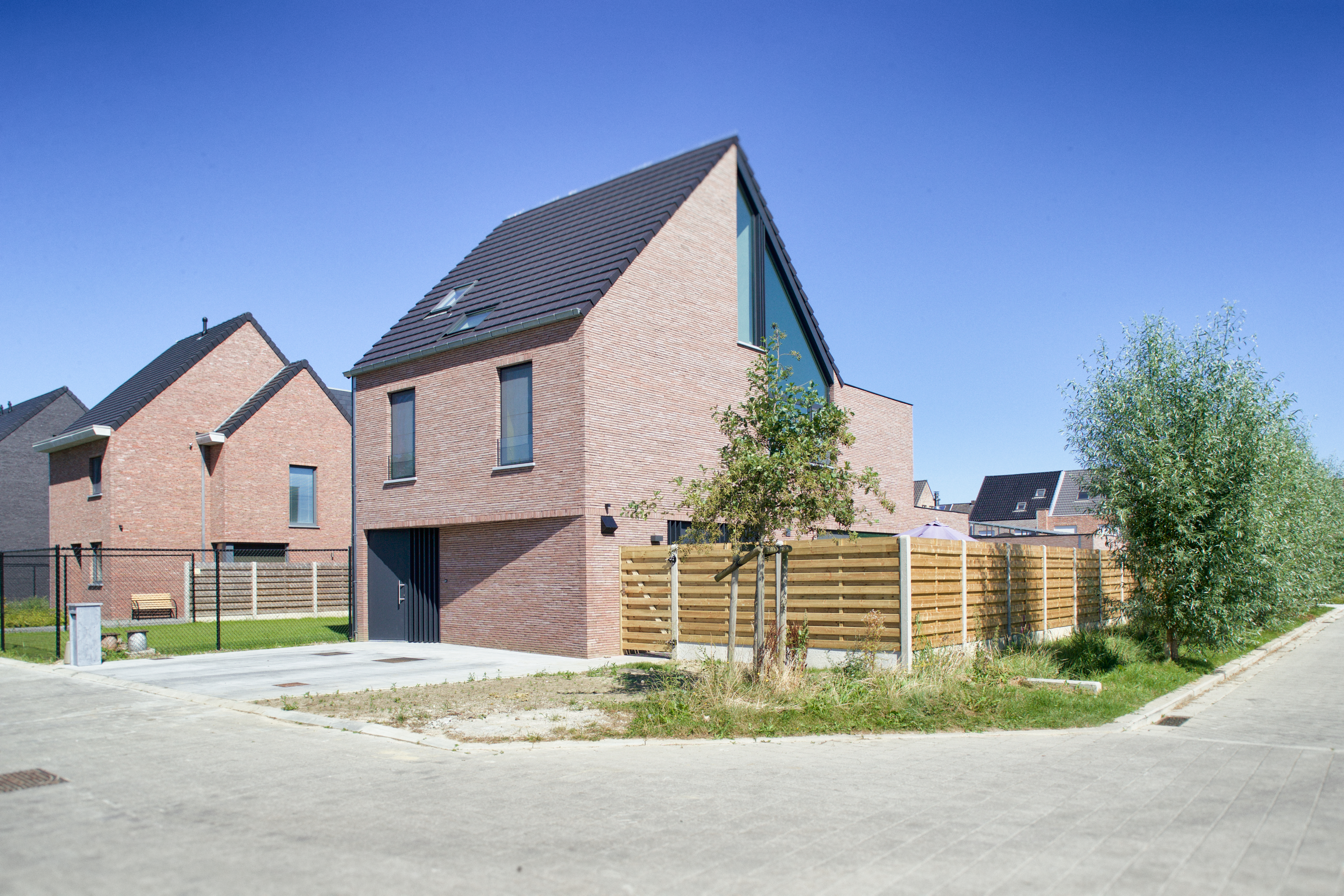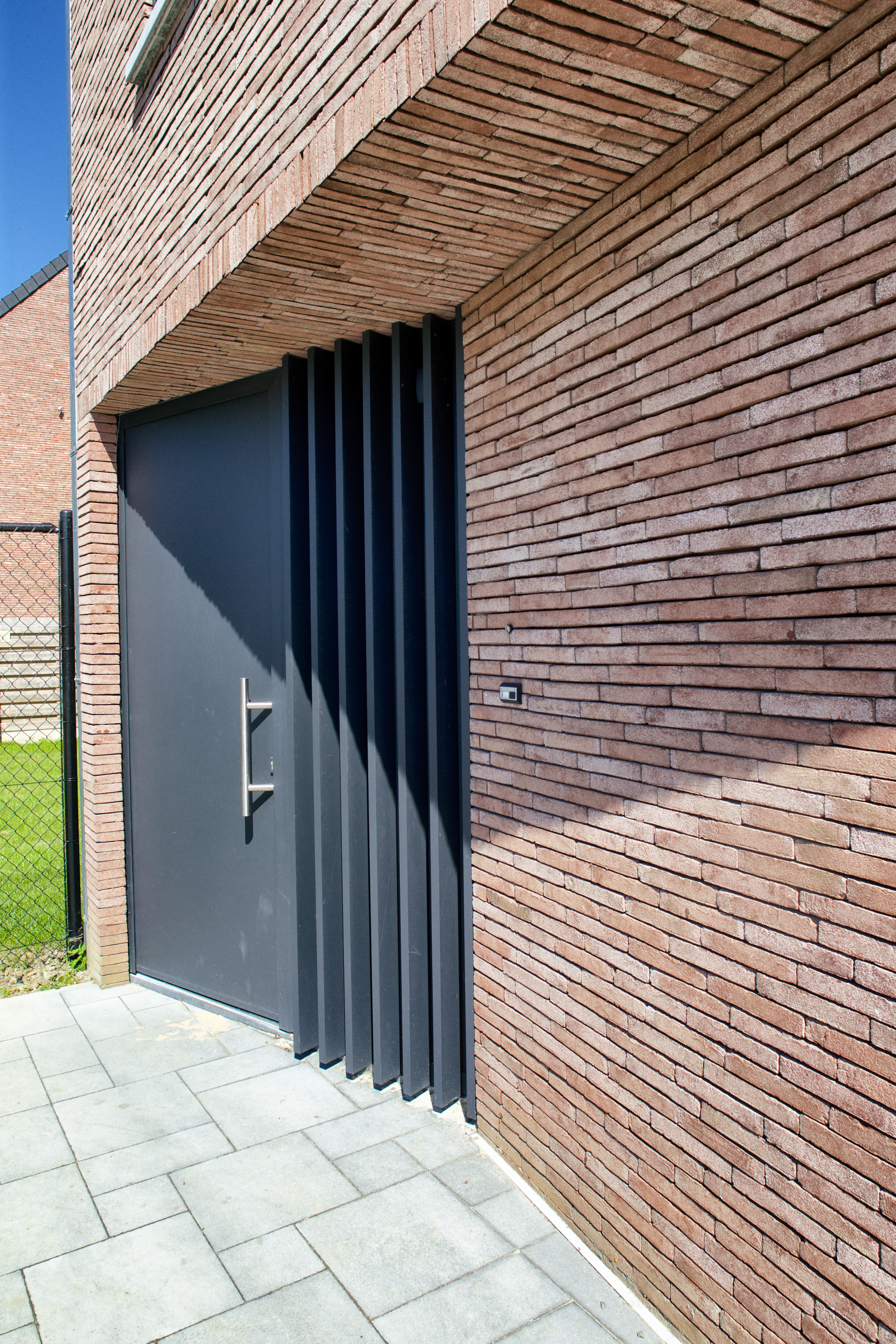 De gevel werd opgetrokken in een mooie verlijmde gevelsteen. Om extra textuur en diepte toe te voegen werden verschillende ramen uitgerust met aluminium lamellen. Die lamellen zijn slechts in geringe mate zonwerend, maar bieden wel extra privacy.