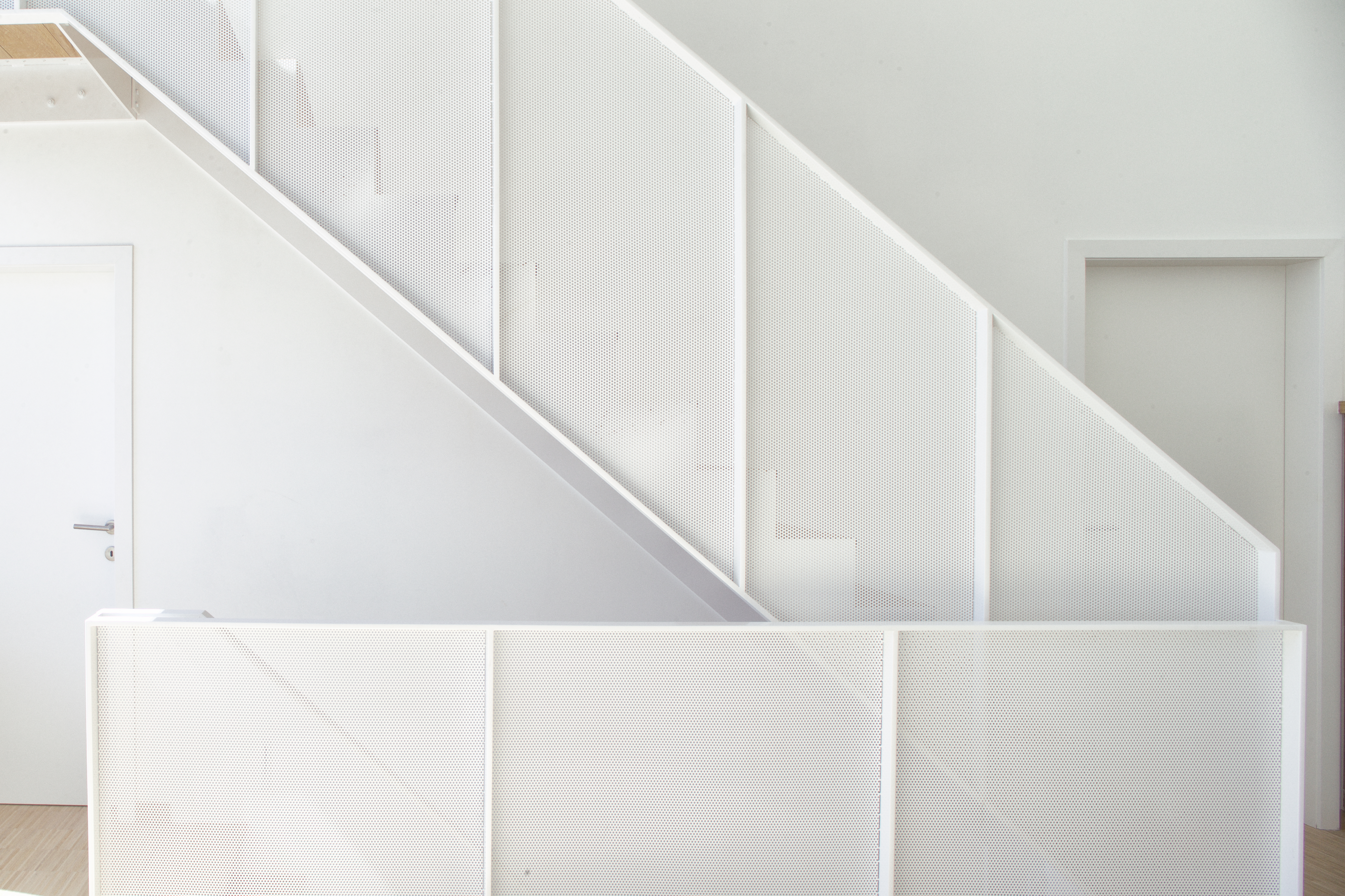 Op de verdieping wordt de nachthal het centrum van de woning. Deze hal wordt gebruikt voor circulatie (met ruimte voor een fraaie trap naar de dakverdieping) én doet dienst als bijkomende bureauruimte. Architecturaal is dat één van de mooiste ruimtes van de woning.