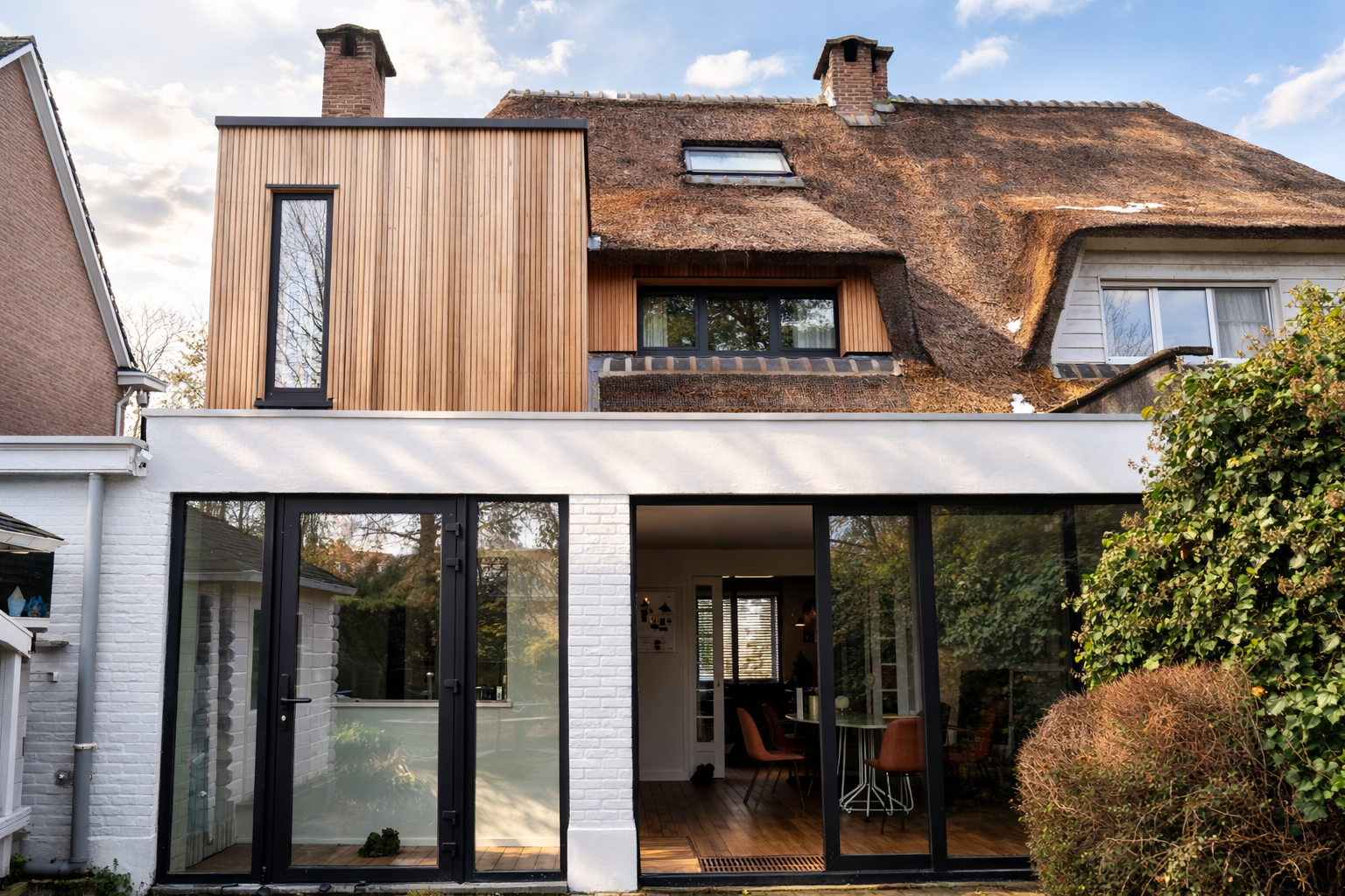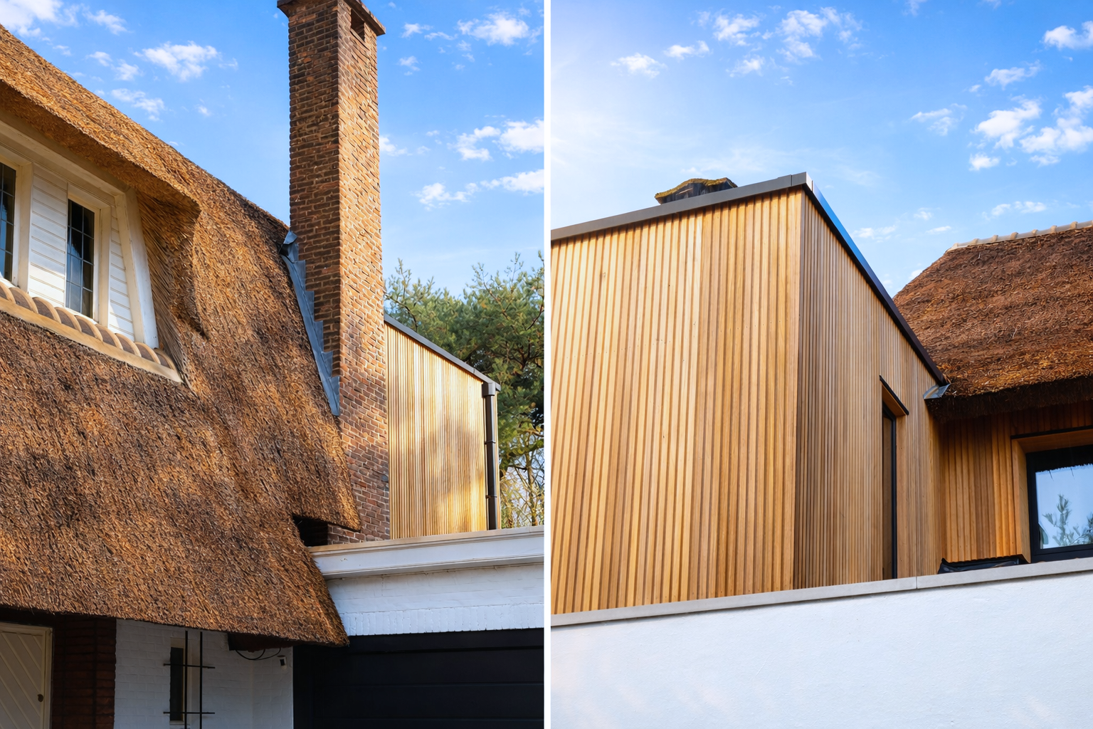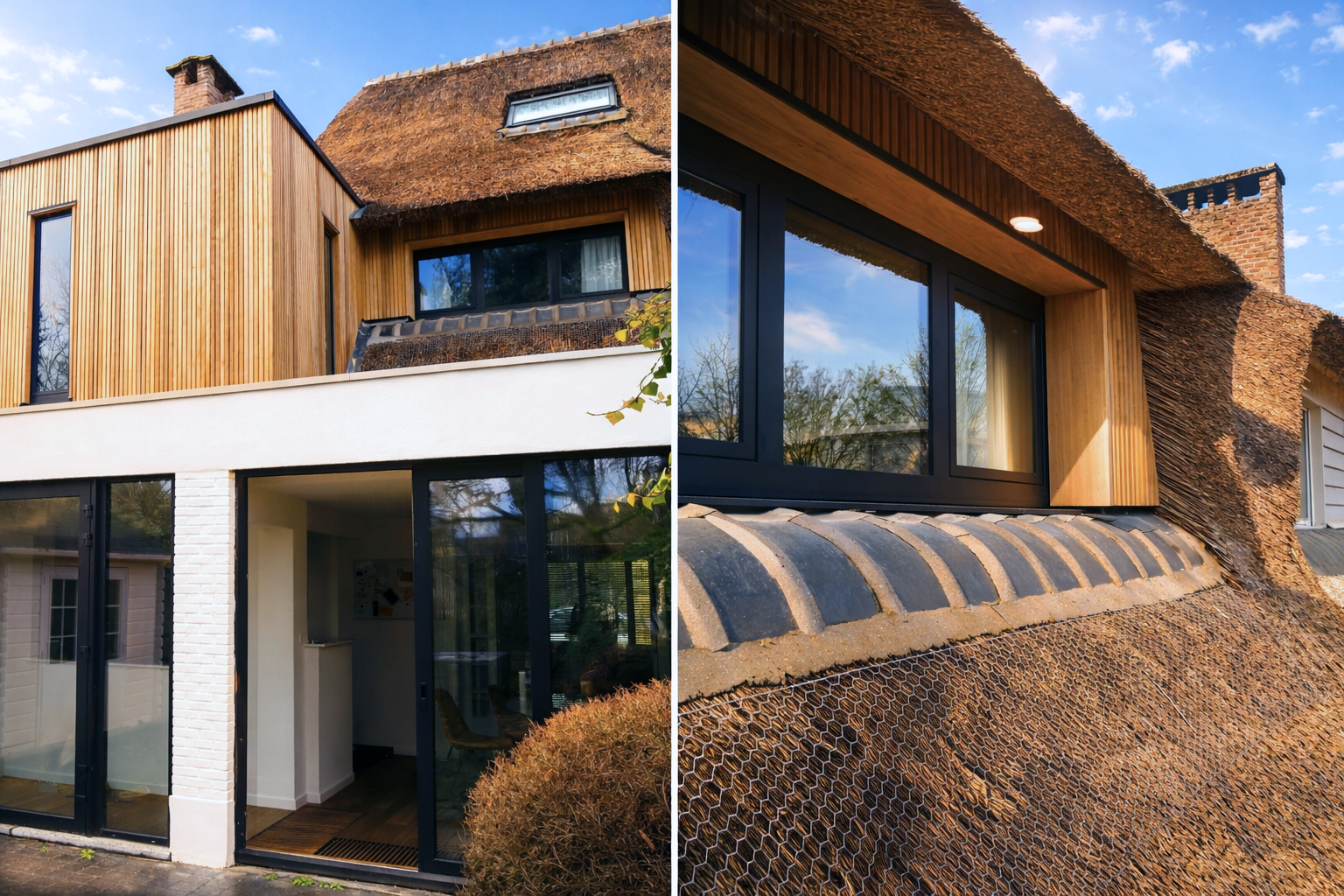 De uitbreiding werd vormgegeven als een helder houten volume dat zich bewust onderscheidt van de bestaande woning. Zo ontstaat een subtiel spanningsveld tussen het traditionele rieten dak en de hedendaagse toevoeging.