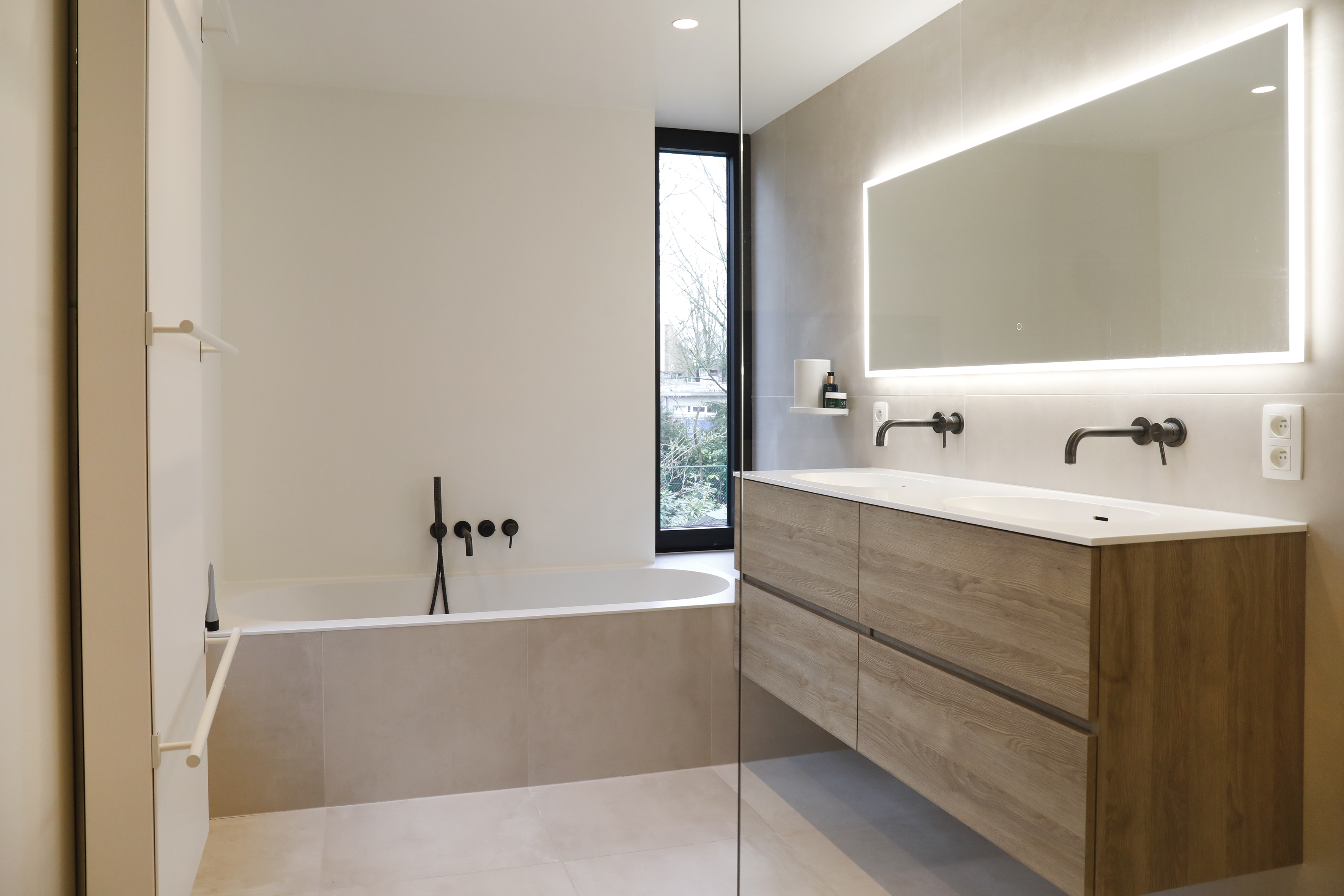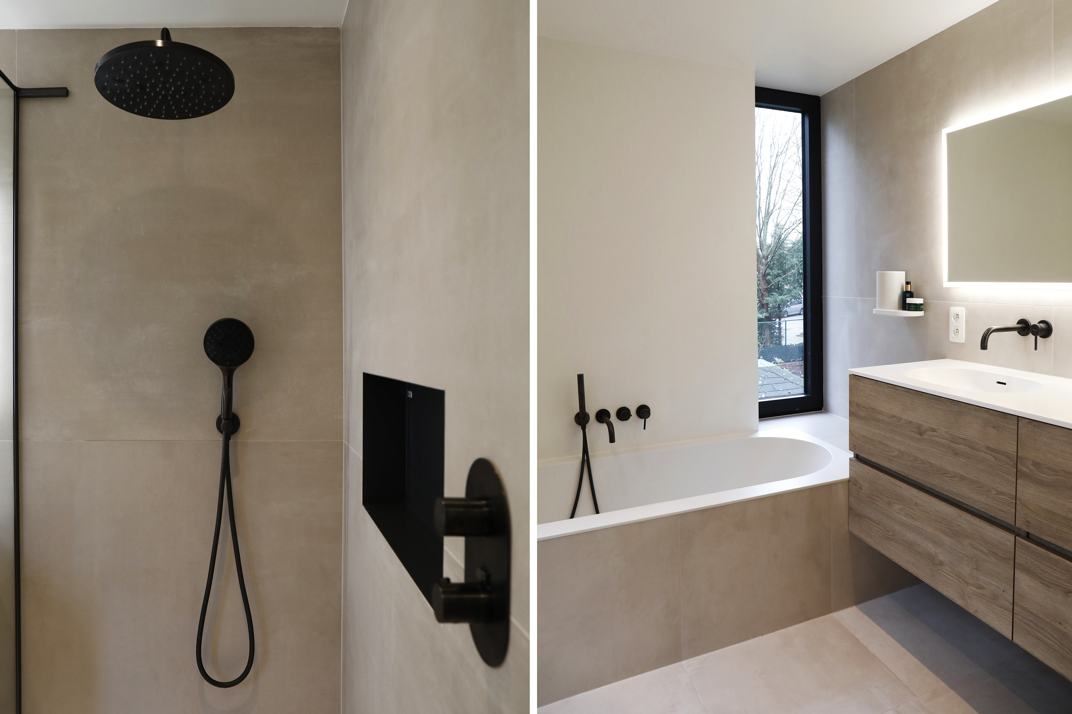 Binnen resulteert dit in een rustige en lichte badkamer met een heldere materialisatie en een sterke relatie met het daglicht. De combinatie van bestaande kwaliteiten en nieuwe ingrepen geeft de woning opnieuw ruimte en comfort.