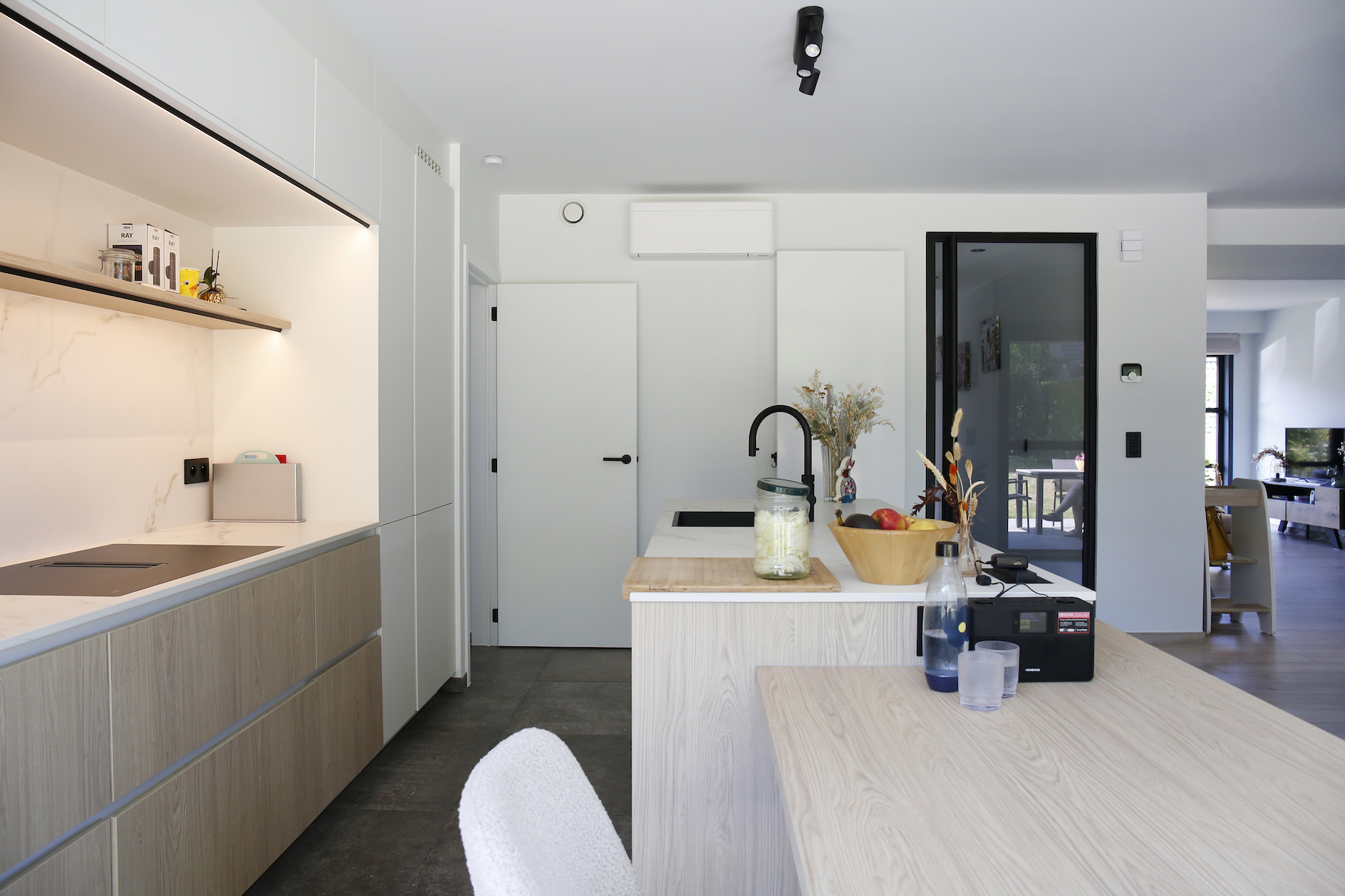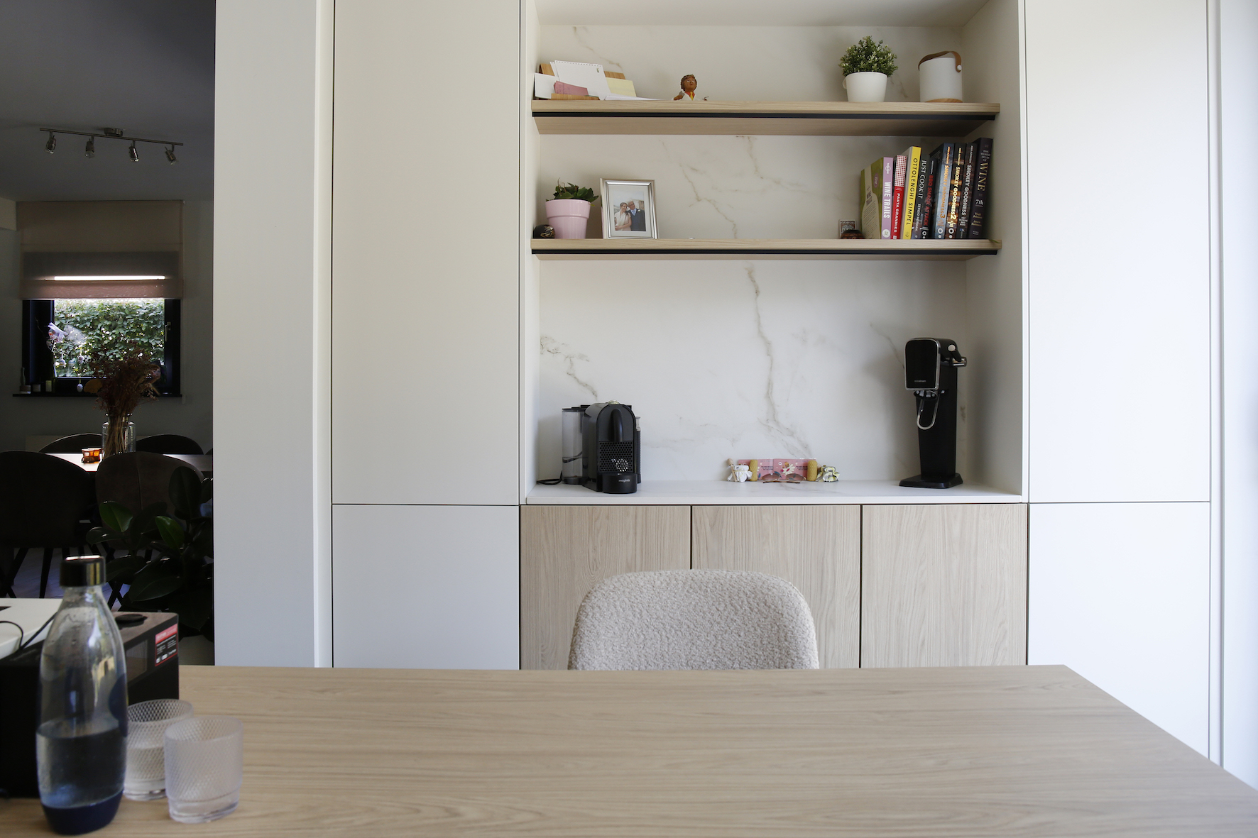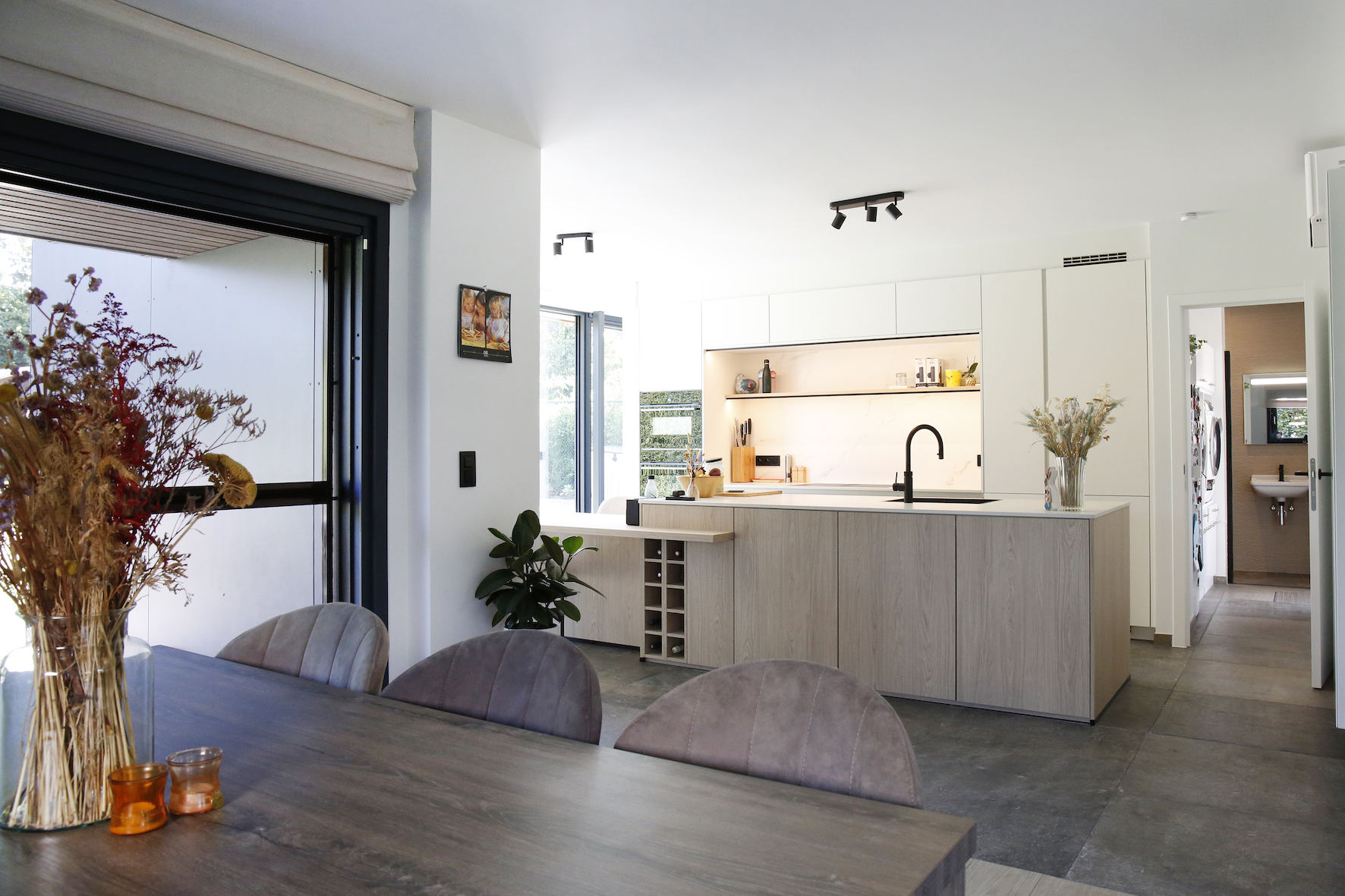 Ook de interne circulatie werd geoptimaliseerd. De gang aan de voordeur werd doorgetrokken tot achteraan de woning, waardoor de leefruimte centraal bereikbaar is en bezoekers niet langer via de zithoek binnenkomen. Vestiairekast en toilet werden mee opgenomen in dit vernieuwde plan.
