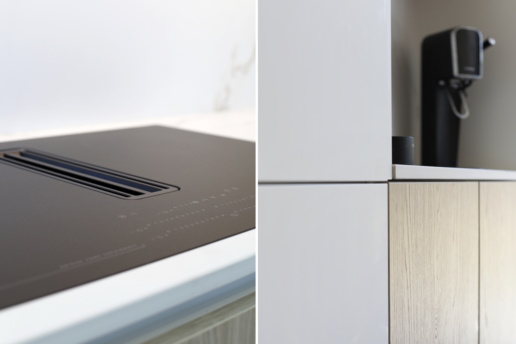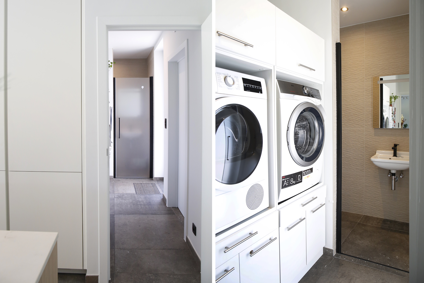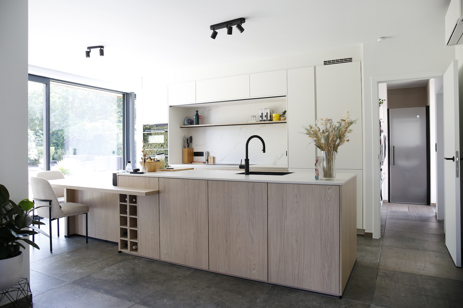 Ook de interne circulatie werd geoptimaliseerd. De gang aan de voordeur werd doorgetrokken tot achteraan de woning, waardoor de leefruimte centraal bereikbaar is en bezoekers niet langer via de zithoek binnenkomen. Vestiairekast en toilet werden mee opgenomen in dit vernieuwde plan.