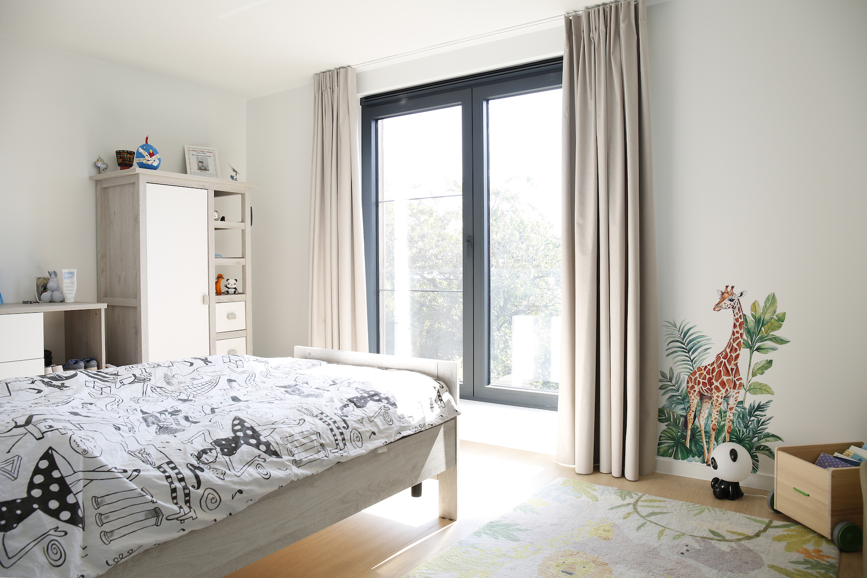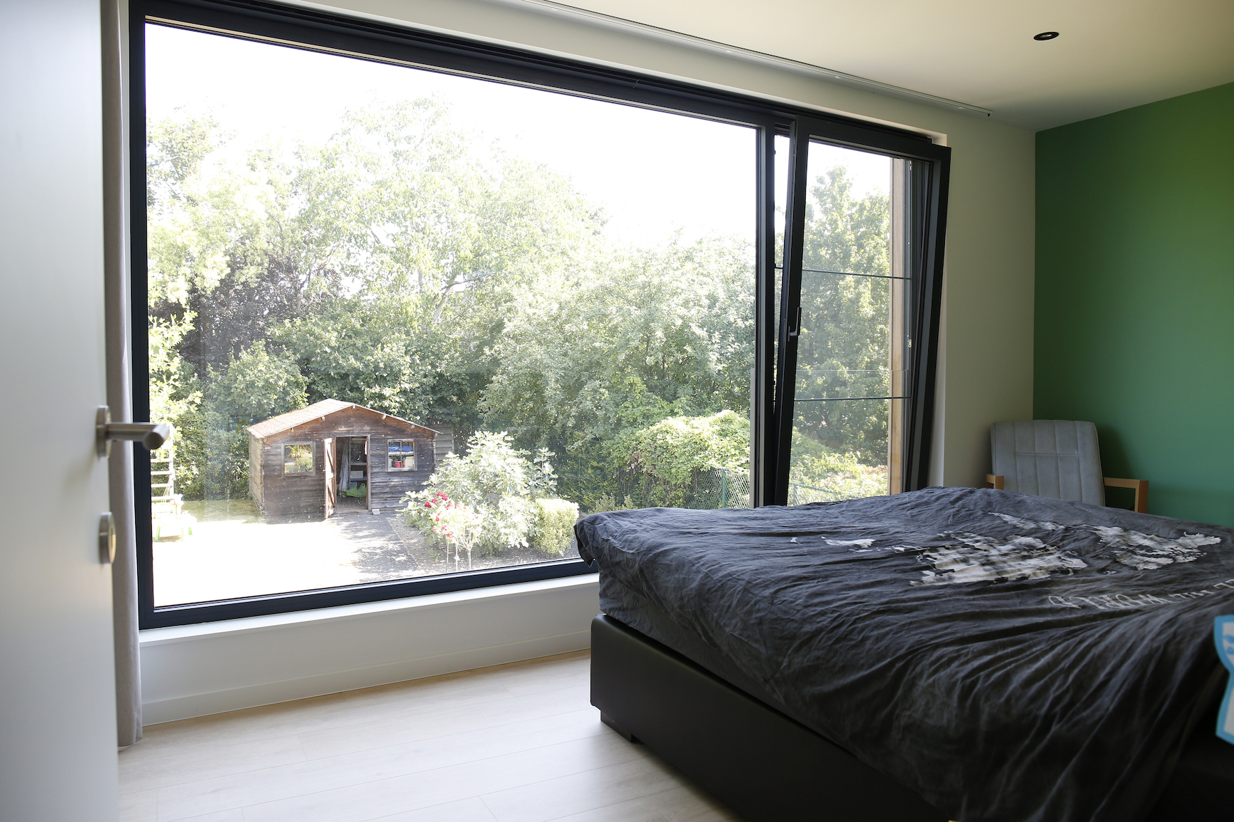 Op de bovenverdieping betekende de uitbreiding een complete herwerking van de indeling. Waar vroeger een kleine slaapkamer zat, ontstonden nu twee volwaardige kamers én een dressing met lichtkoepel.