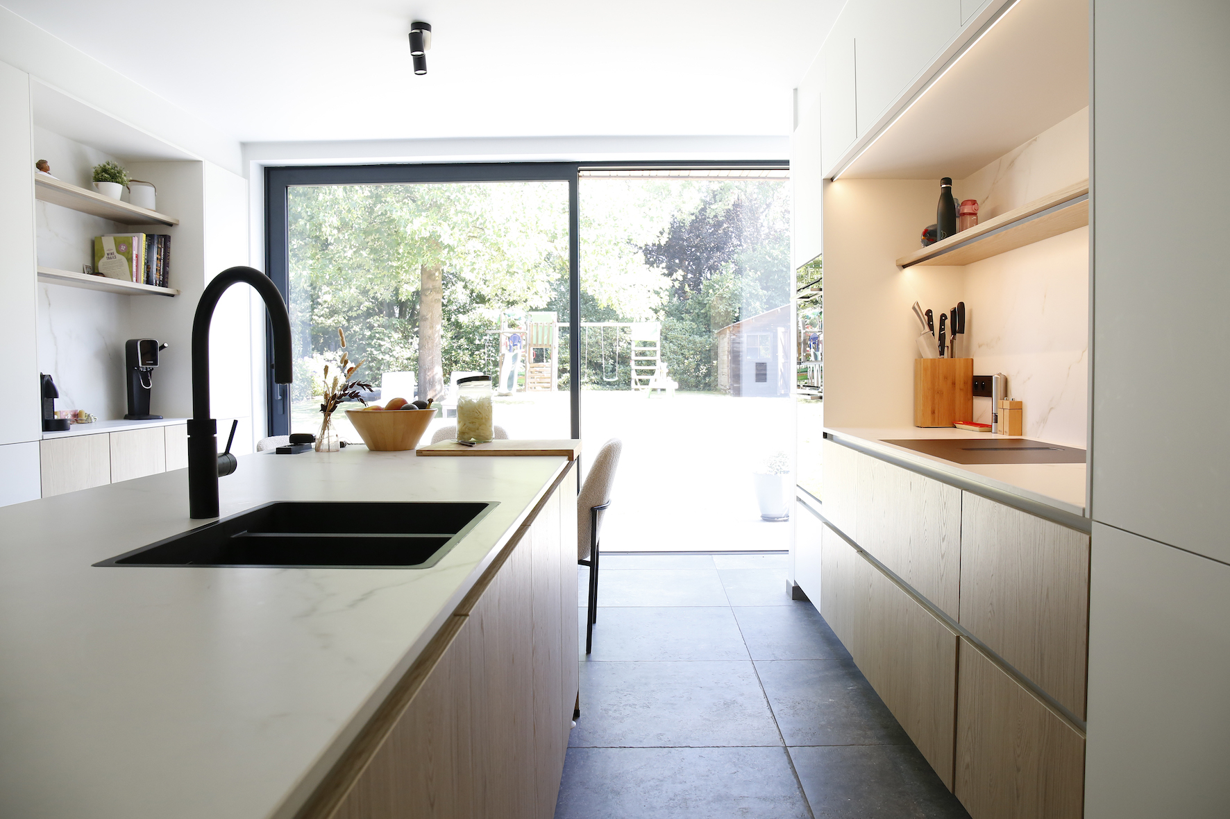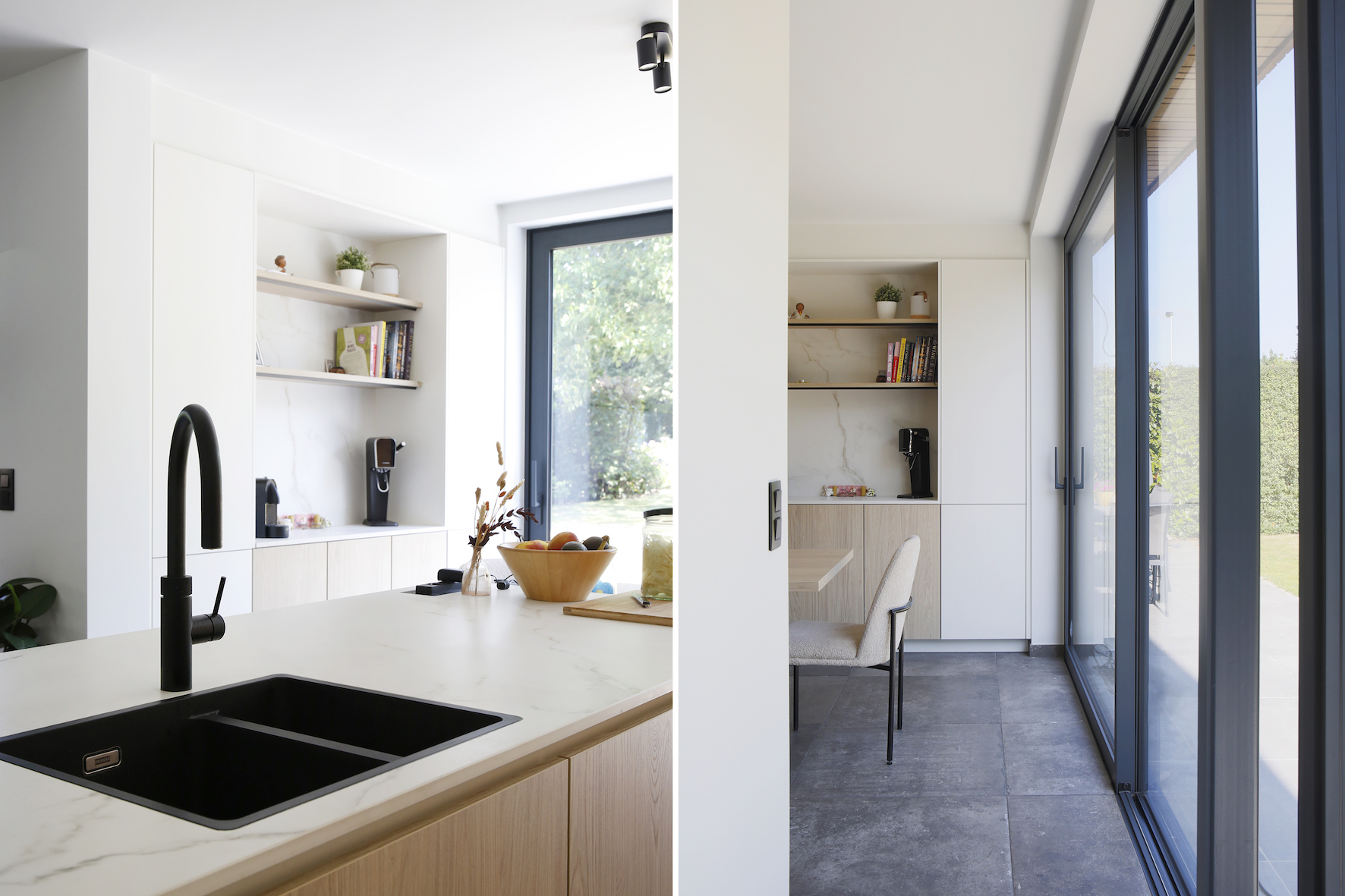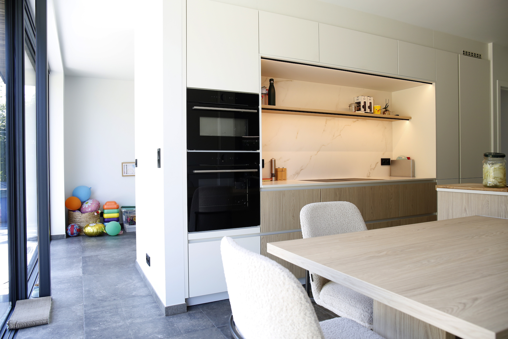 De nieuwe aanbouw werd subtiel in het bestaande volume geschoven. Op het gelijkvloers werd de keuken ruimer en kreeg ze een open verbinding met een nieuwe speelhoek, die later kan omgevormd worden tot bureau. Deze ruimte kijkt uit op de tuin en vormt een rustgevende plek met veel daglicht. Via de vernieuwde zij-ingang komt men nu in een praktische achterinkom met wasplaats en douche, ideaal voor een gezin met jonge kinderen.