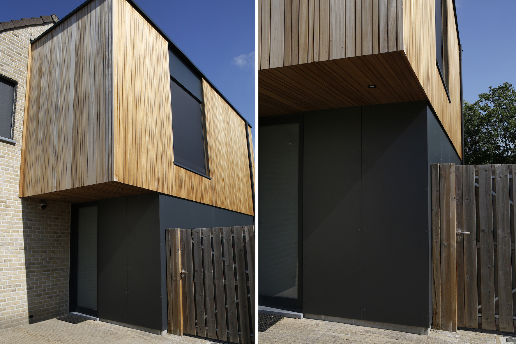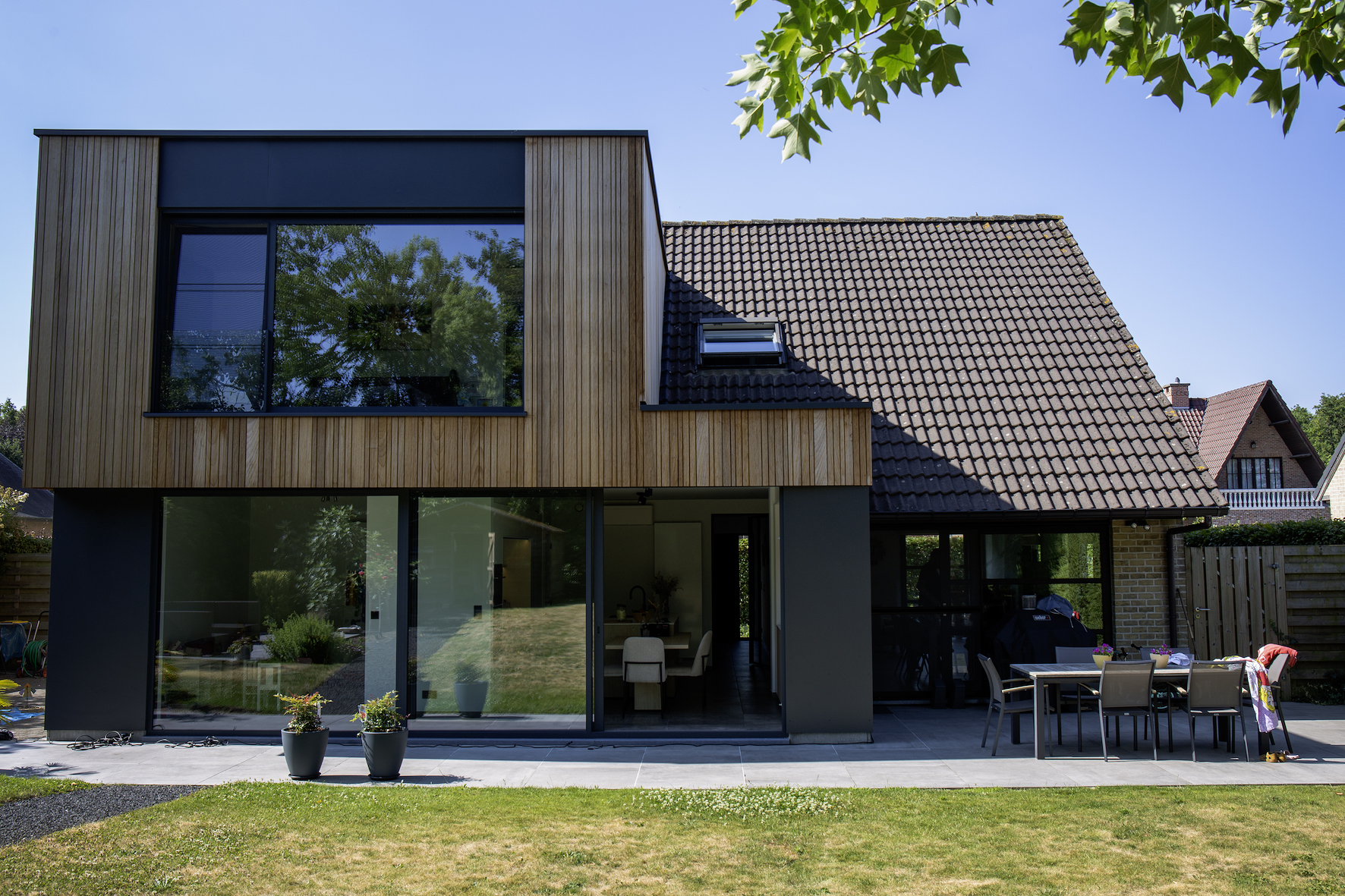 De keuze voor houtskeletbouw lag voor de hand: het bestaande huis was al zo opgebouwd, dus ook de uitbreiding werd licht, snel en duurzaam gerealiseerd. Voor de gevelbekleding werd gekozen voor hout, gecombineerd met contrasterende zwarte vezelcementplaten op het gelijkvloers. Dit zorgt voor een moderne, gelaagde uitstraling waarbij het bovenvolume als het ware zweeft boven de donkere sokkel.