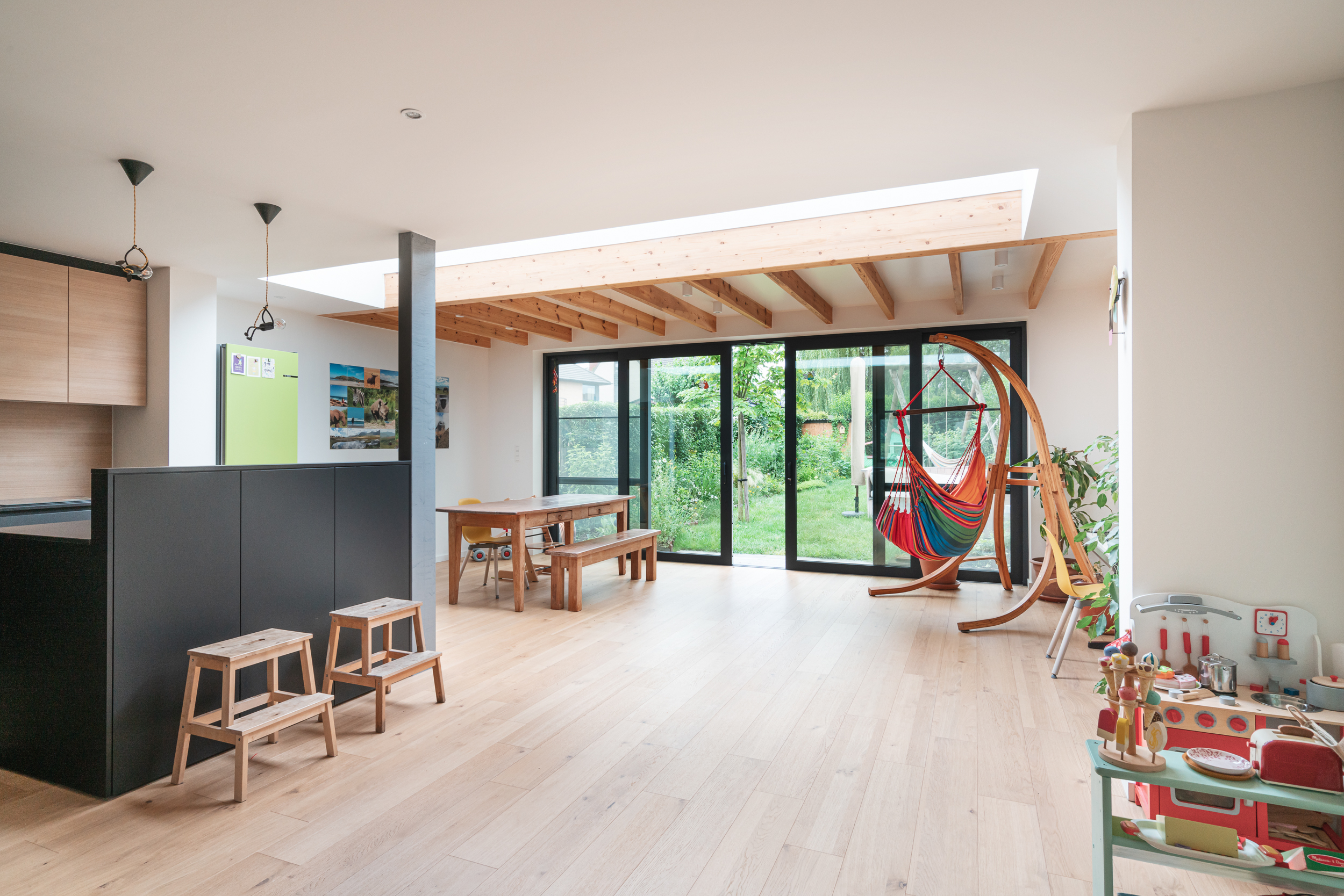 Bij deze woning in Kontich-Kazerne werd ons gevraagd om de leefruimte uit te breiden. Op die manier kregen de keuken, eetkamer en speelhoek de plaats die ze verdienden.
