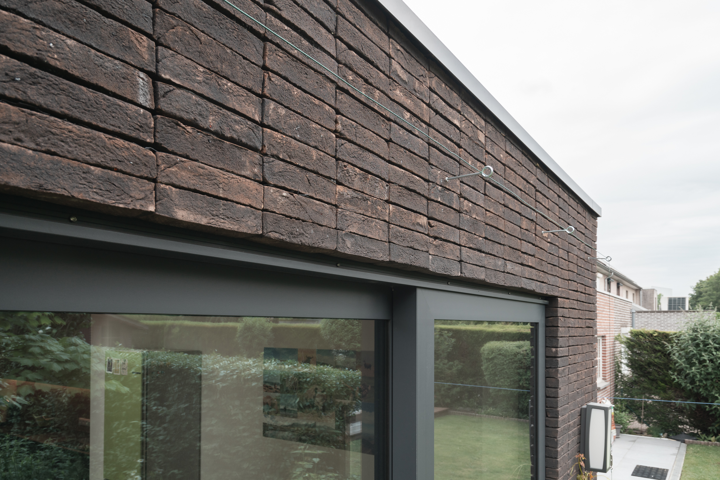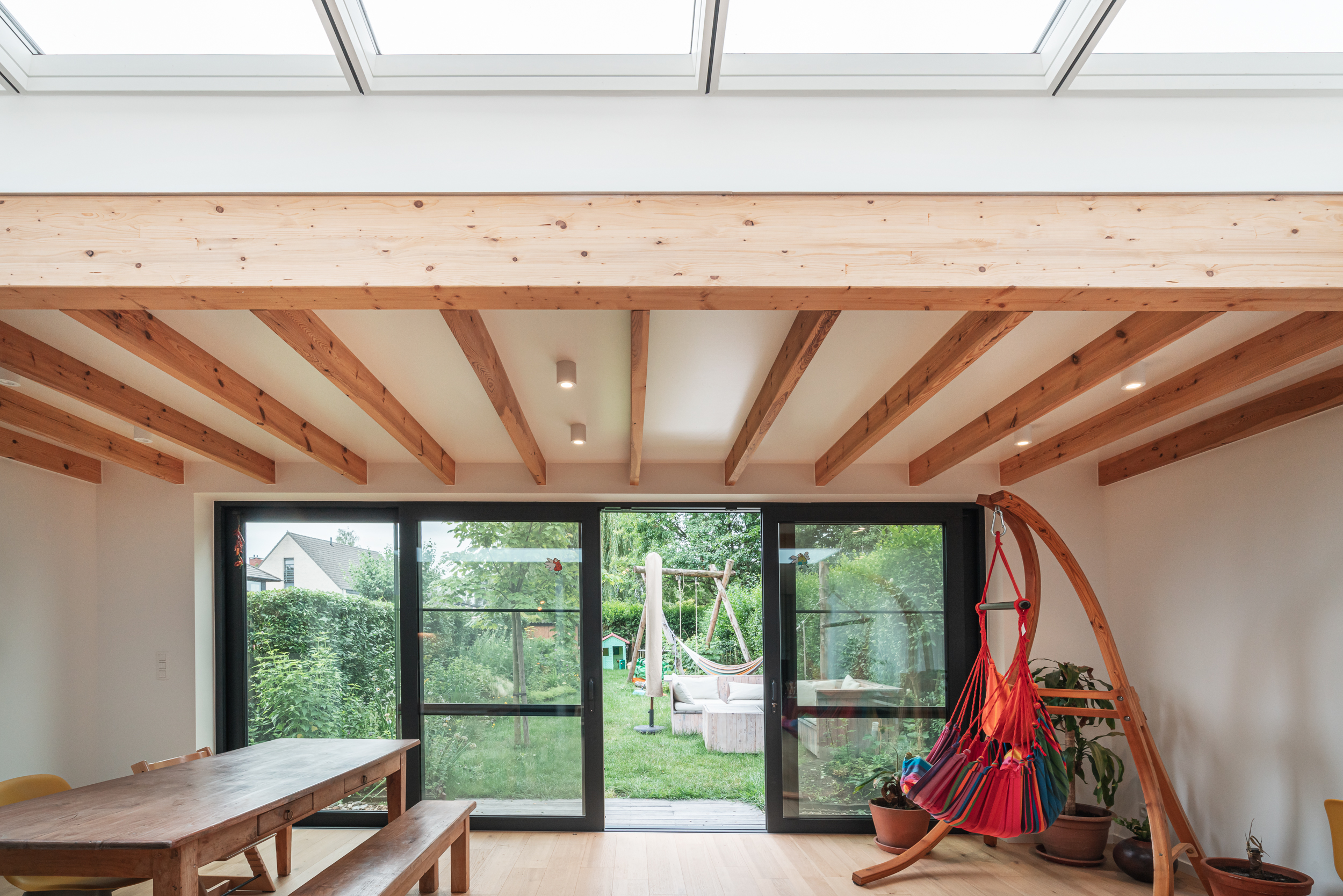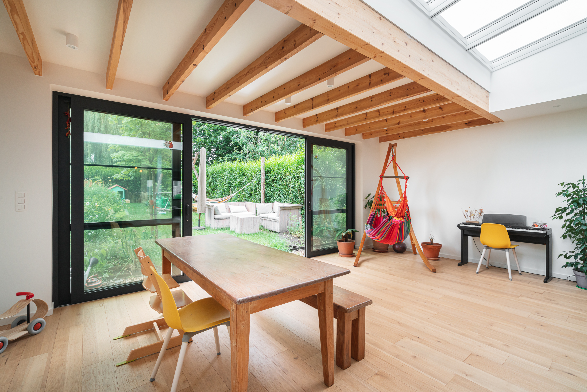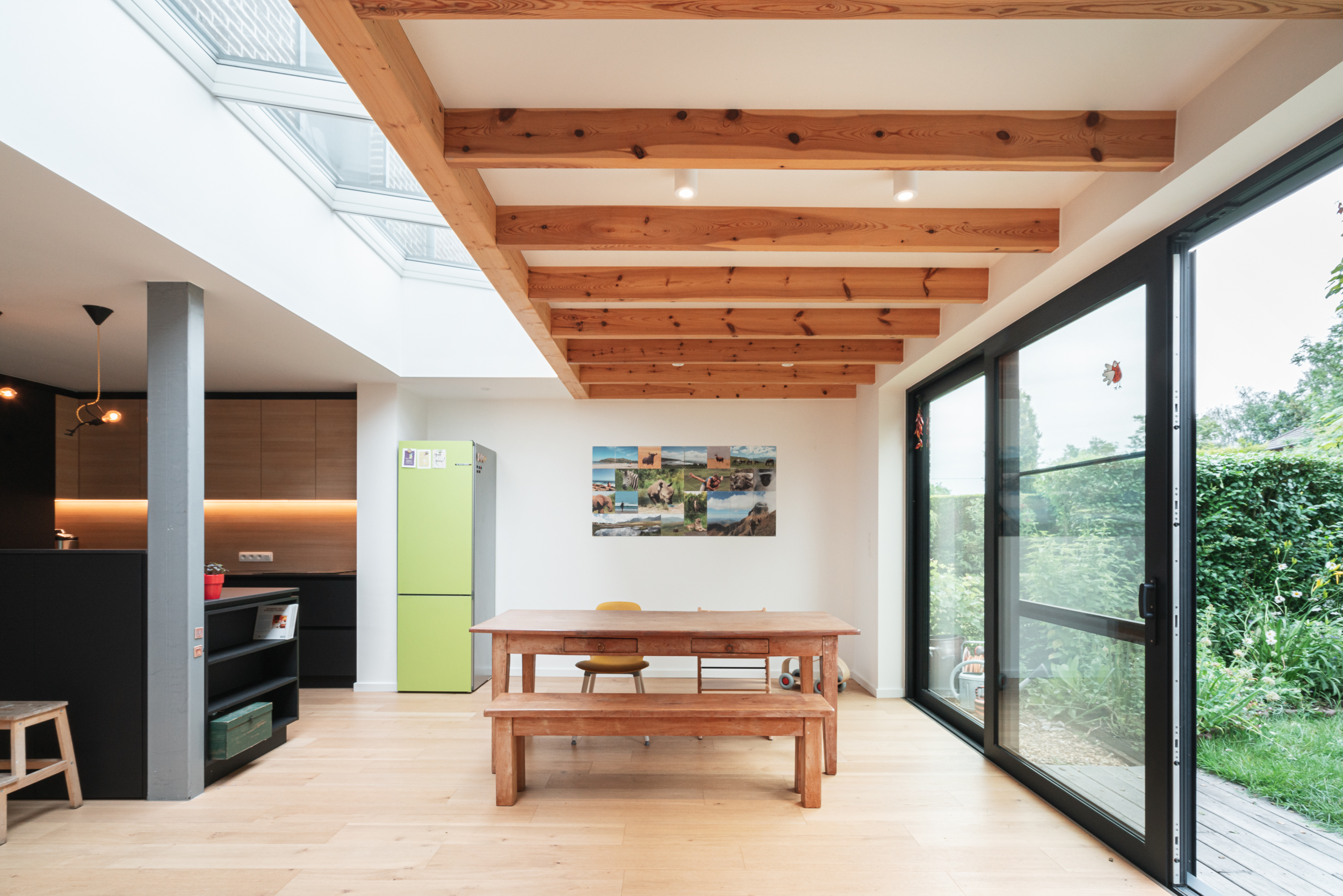 Het zicht op de tuin werd evident gerealiseerd door een groot schuifraam. Van hieruit is het terras direct toegankelijk op zomerse dagen én komt er voldoende daglicht in de ruimte.
