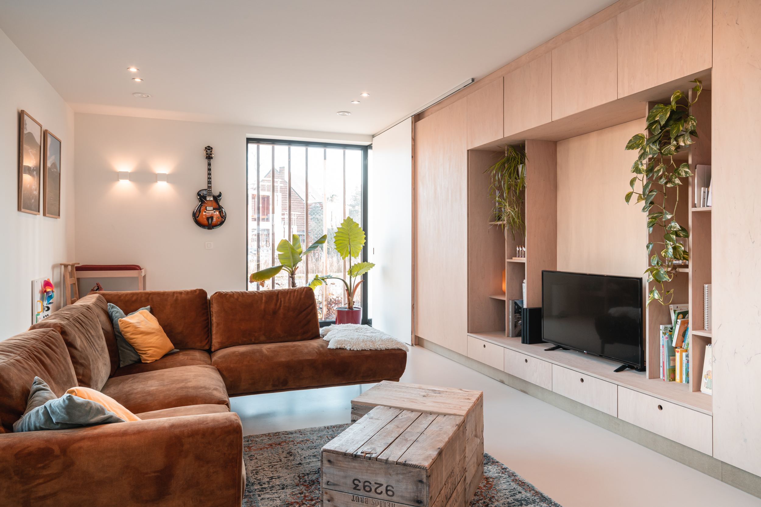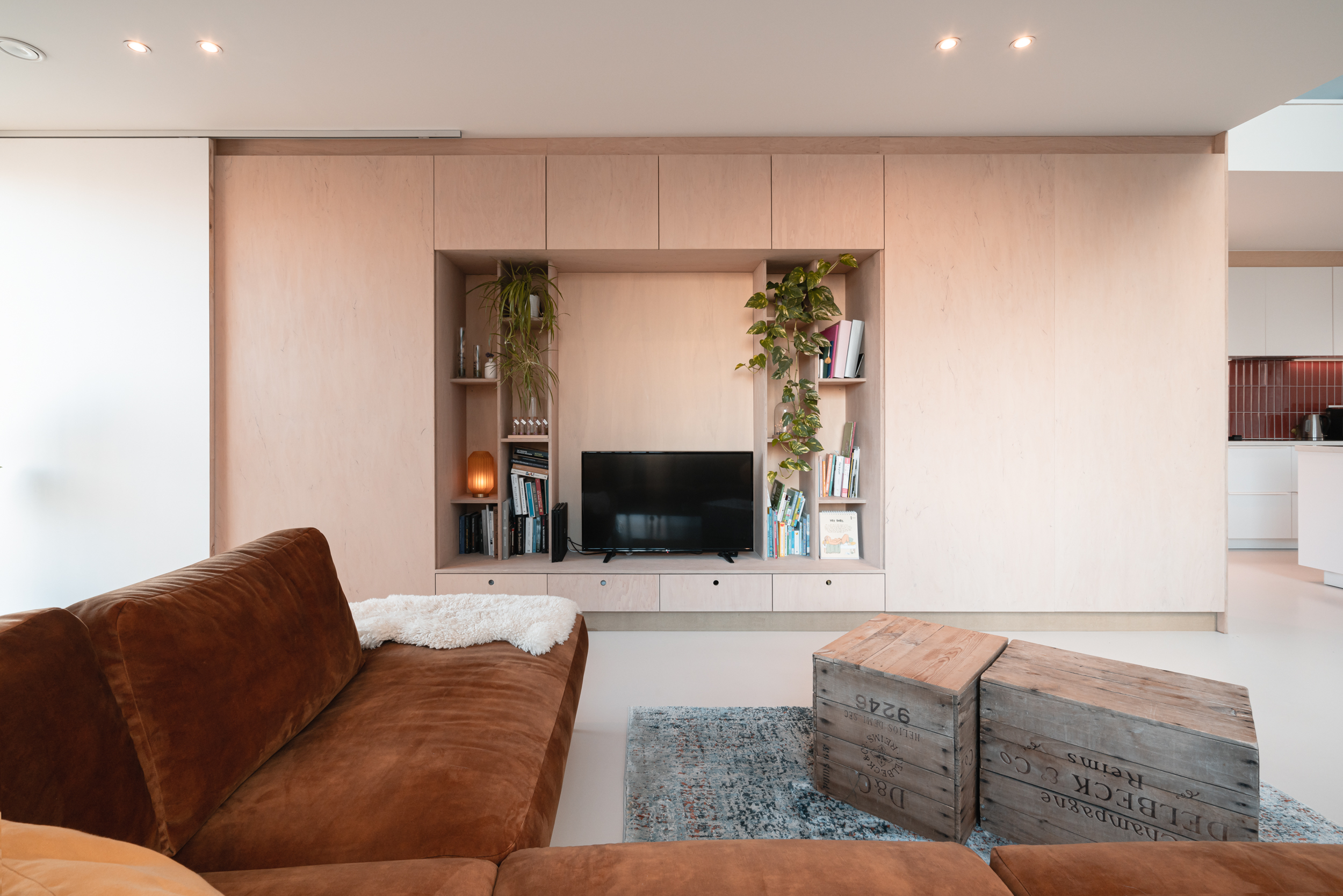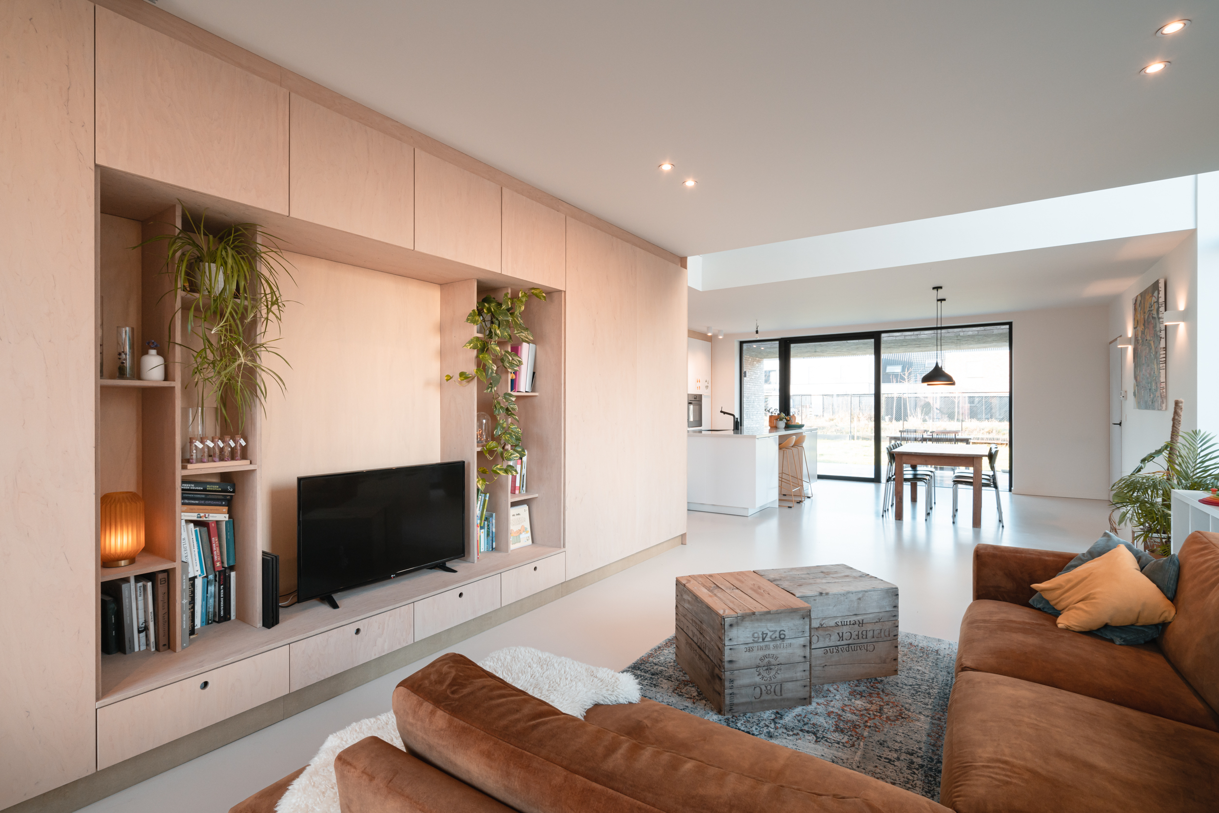 Het is duidelijk dat de bouwheer veel aandacht besteedde aan een stijlvol en warm interieur. Dat komt beleving van deze woning zeker ten goede. Het maatmeubilair zorgt voor extra opbergruimte, sfeer en gezelligheid. We zijn trots op dit project.