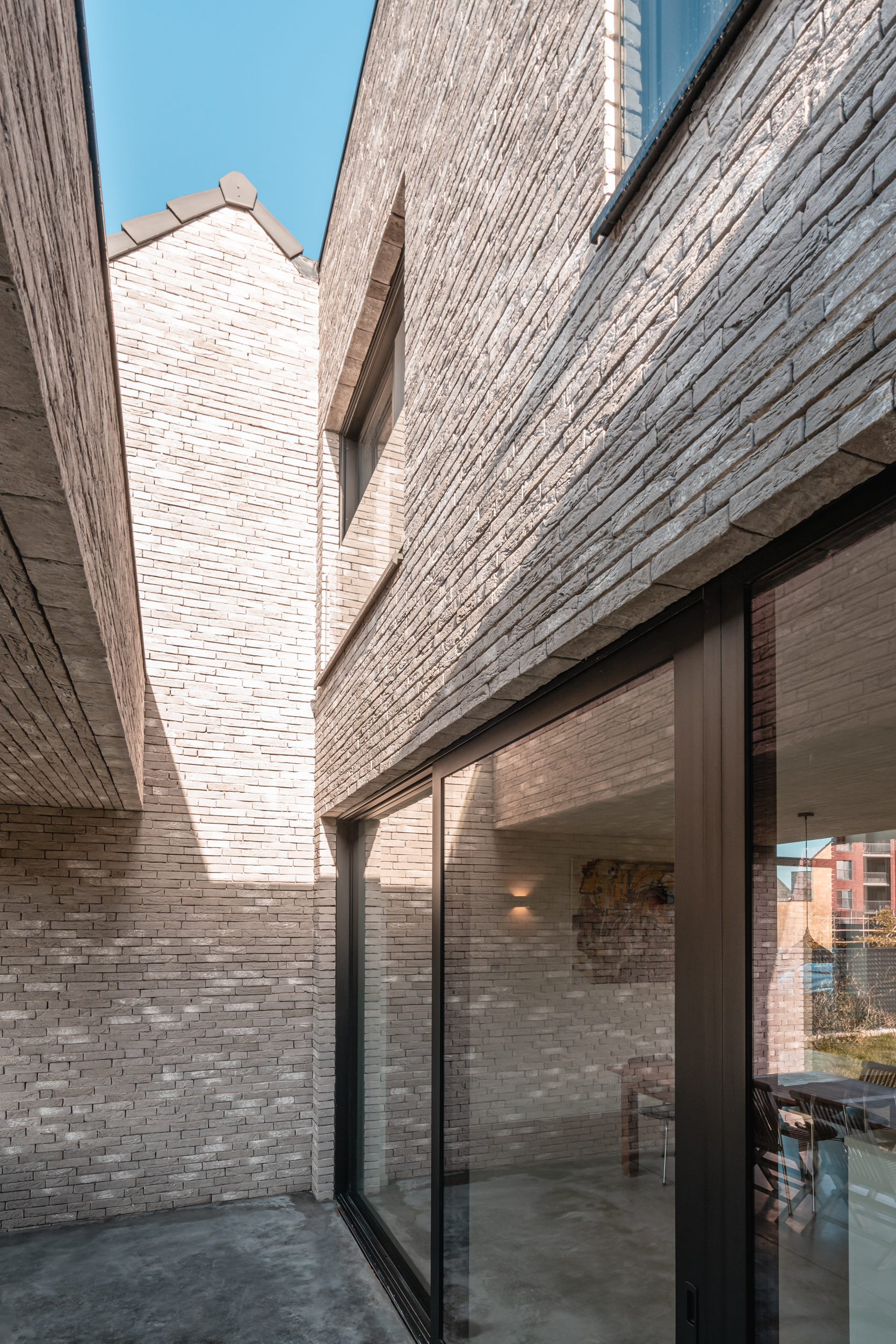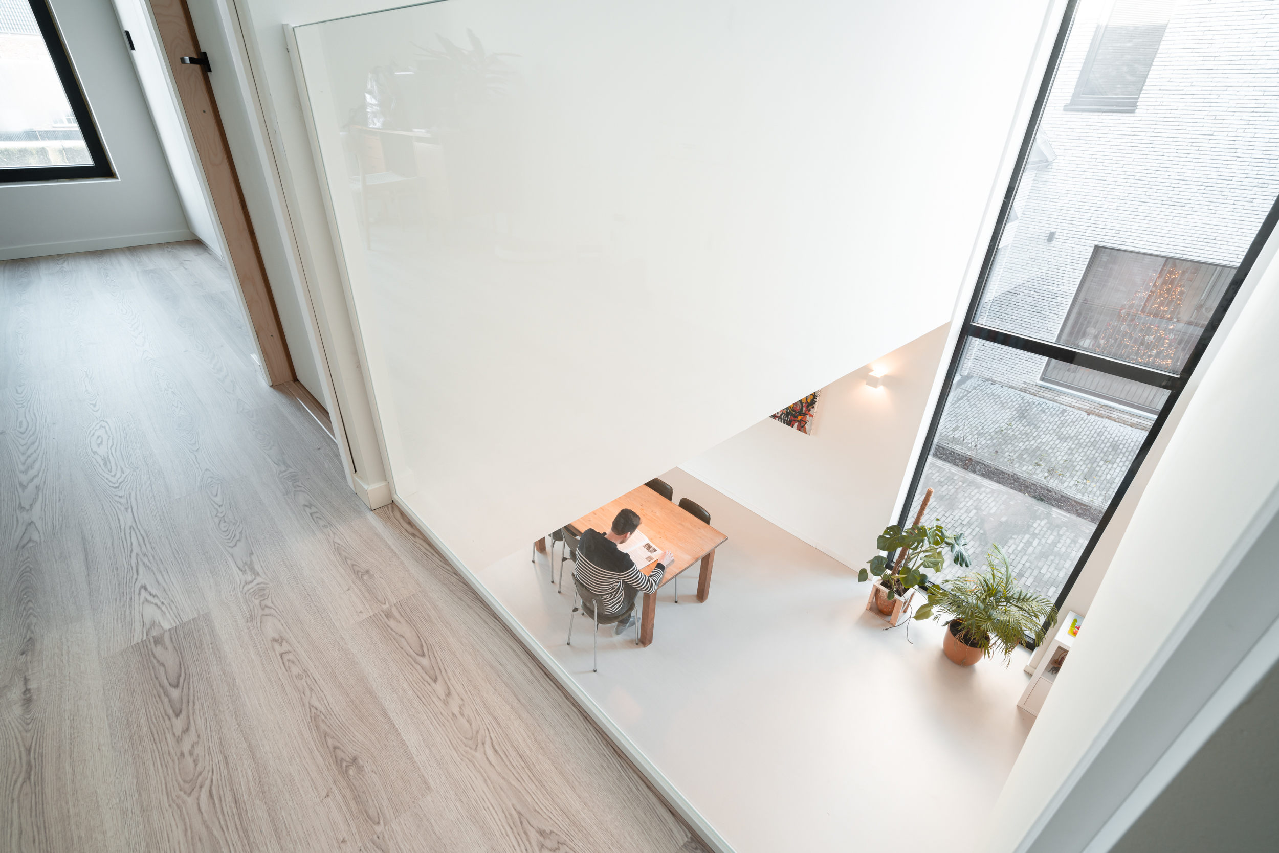 Het concept van de woning wordt mee bepaald door de vide. Deze opening in de vloer/plafond maakt daglichttoetreding tot centraal in de woning mogelijk. Bovendien heeft deze ontwerpkeuze qua gevoel een verruimend effect. Plots staan het gelijkvloers en de verdieping in verbinding met mekaar.