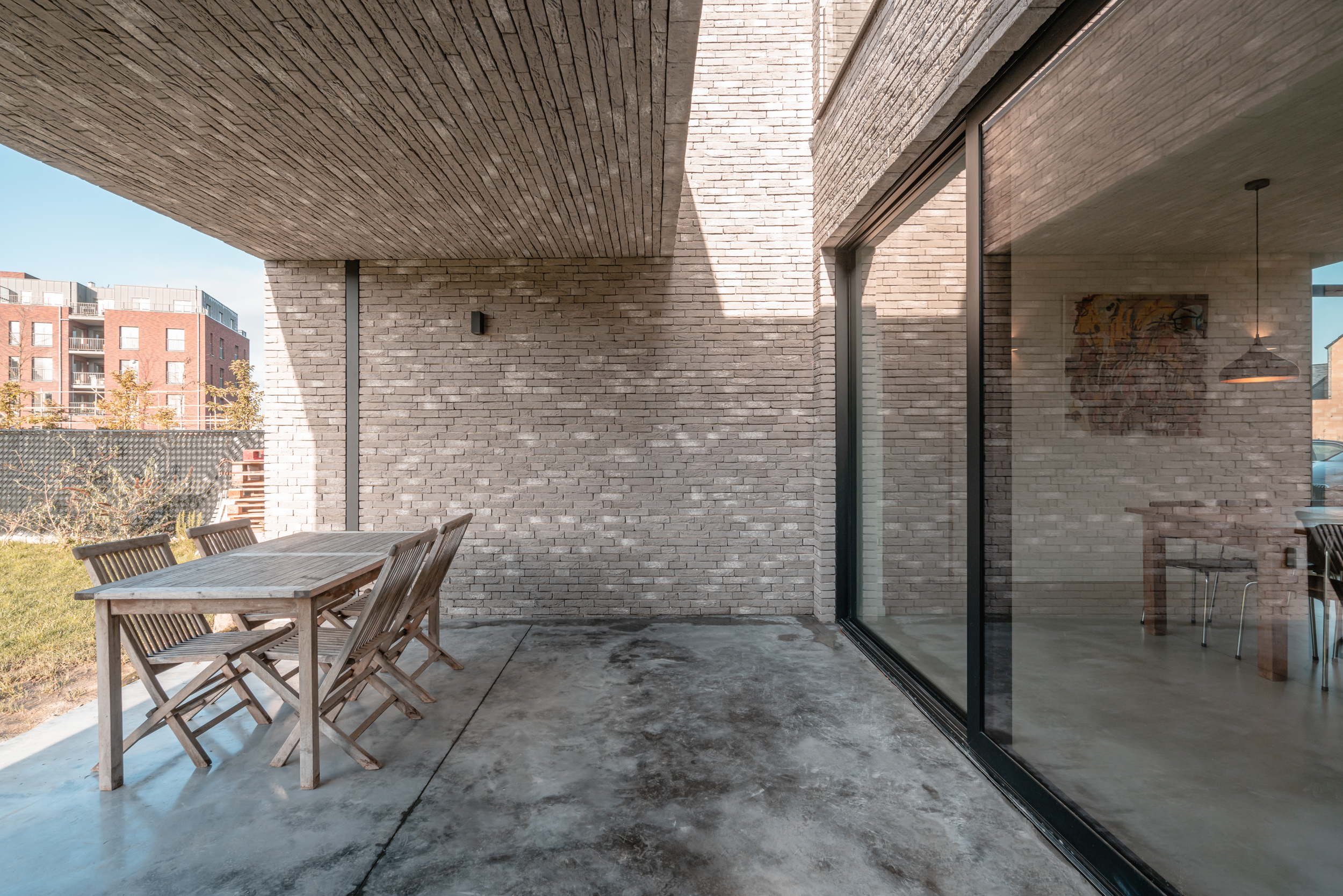 Ten eerste werd aan de achterkant van de woning een overdekt terras voorzien. Hierdoor wordt het grootste raam van de woning afgeschermd van rechtstreeks zonlicht. Een opening in de terrasoverkapping zorgt anderzijds wel voor voldoende diffuus licht. Dit overdekt terras is zowel nuttig bij zonnig als bij regenachtig weer.